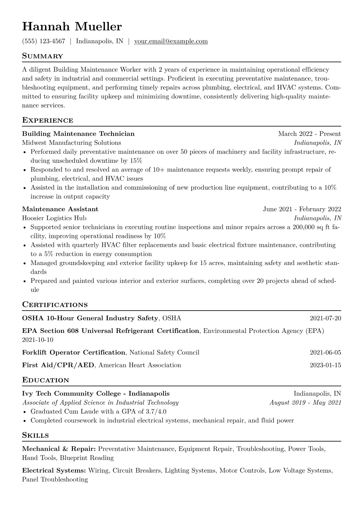 For an entry-level Building Maintenance Worker in manufacturing, hiring managers seek practical, safety-conscious individuals ready to contribute to facility uptime. A strong resume highlights hands-on experience with preventative maintenance, troubleshooting, and basic repairs across electrical, plumbing, HVAC, and carpentry systems. Specific achievements include completing work orders efficiently, assisting with equipment installations, or maintaining facility infrastructure. Understanding lockout tagout (LOTO) procedures and holding certifications like OSHA 10 are crucial, demonstrating a commitment to safety in a busy industrial environment where operational continuity is paramount. Familiarity with common industrial tools and maintenance documentation is also highly valued.