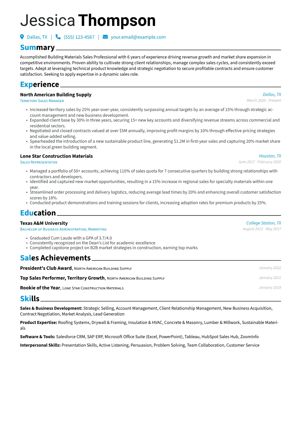 A strong resume for a mid-level Building Materials Sales professional clearly showcases direct impact within the construction materials sector. Hiring managers specifically look for quantified achievements in revenue generation, new account acquisition, and territory growth with contractors and builders. Crucially, demonstrate expertise in product lines like lumber, roofing, or insulation, alongside proficiency in bid management, quoting, and understanding supply chain logistics. Highlight accomplishments such as exceeding sales quotas by specific percentages or successfully integrating new product offerings.