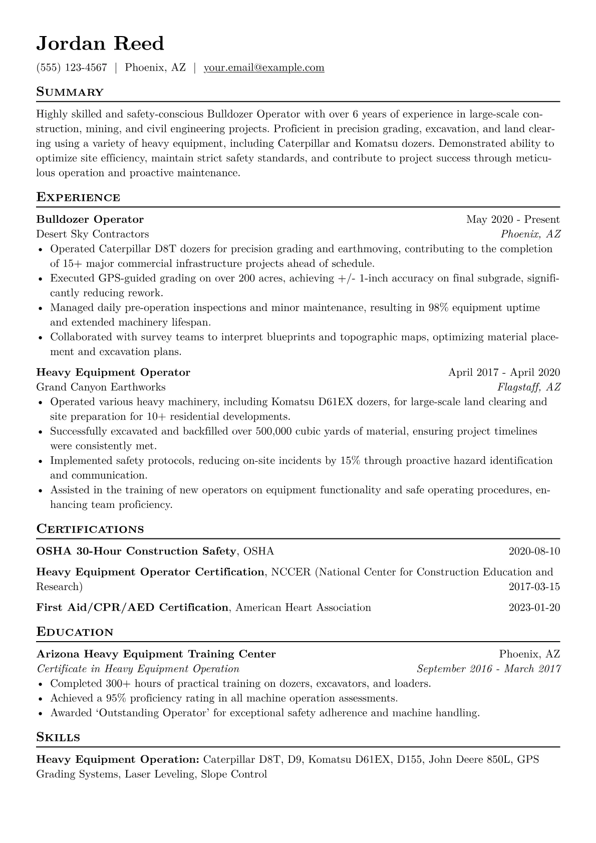 This template was built with JobSprout and can be remixed to create your own tailored Bulldozer Operator resume. Begin crafting your professional profile today.