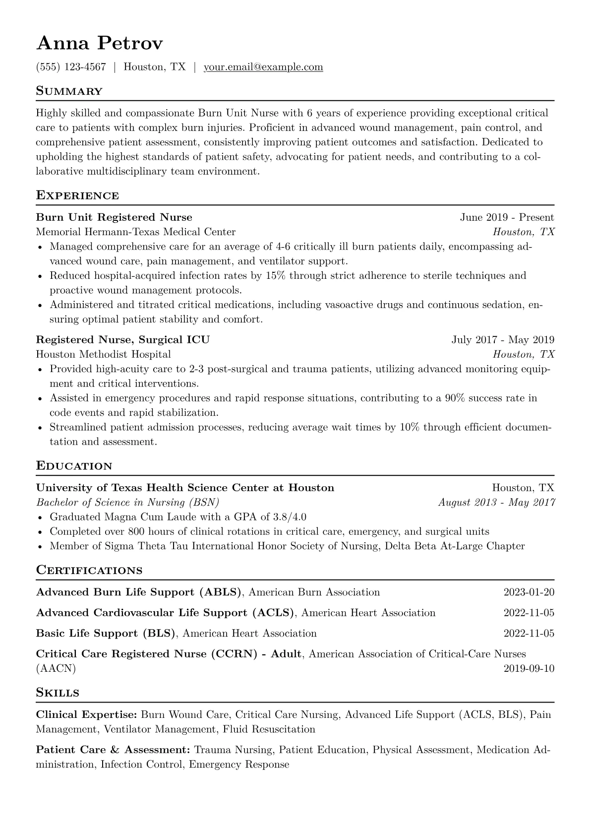 This template was built with JobSprout and can be remixed to create your own tailored Burn Unit Nurse resume.