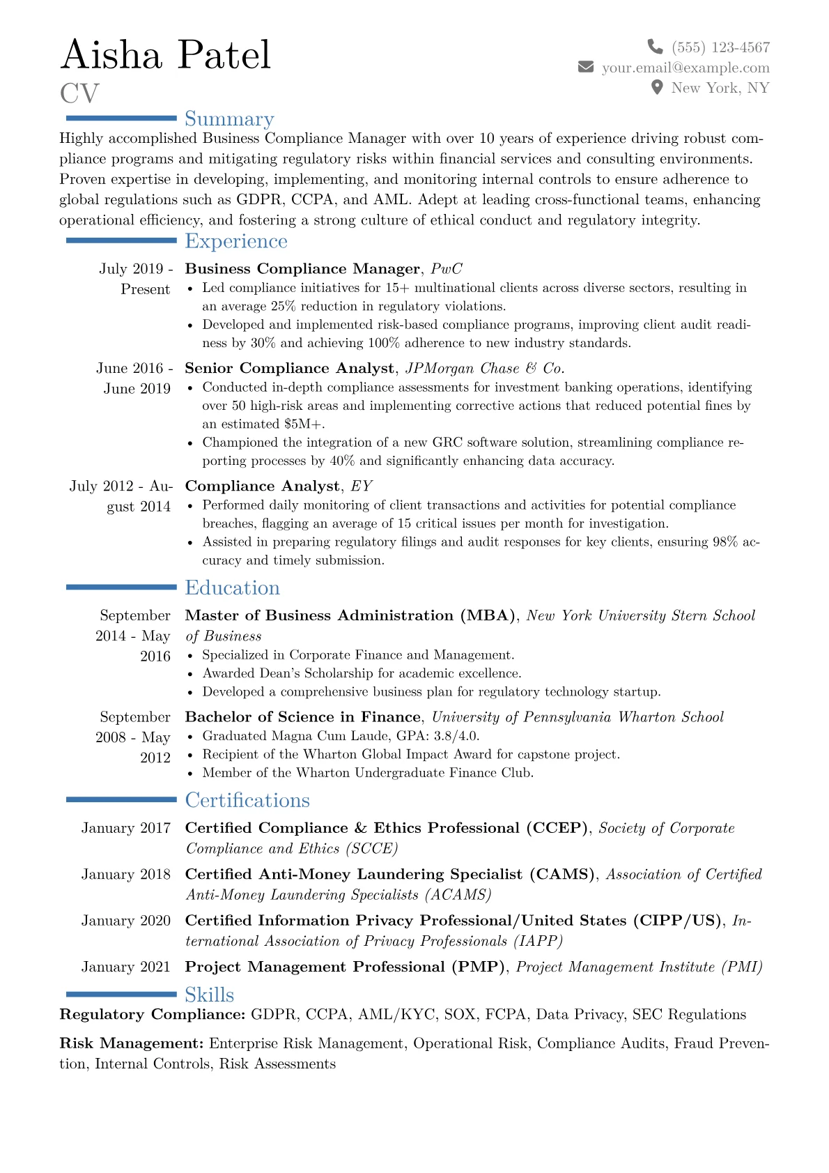 This example resume effectively showcases these critical elements. It quantifies achievements clearly, such as "Reduced client non-compliance risk by 20% across three major projects," directly linking compliance efforts to business outcomes. Skills are grouped logically into categories like "Regulatory Expertise & Risk Management" and "Consulting & Client Engagement," highlighting a blend of technical and client-facing competencies. Crucially, relevant certifications and proficiency with GRC software platforms are prominently featured, immediately communicating specialized qualifications.