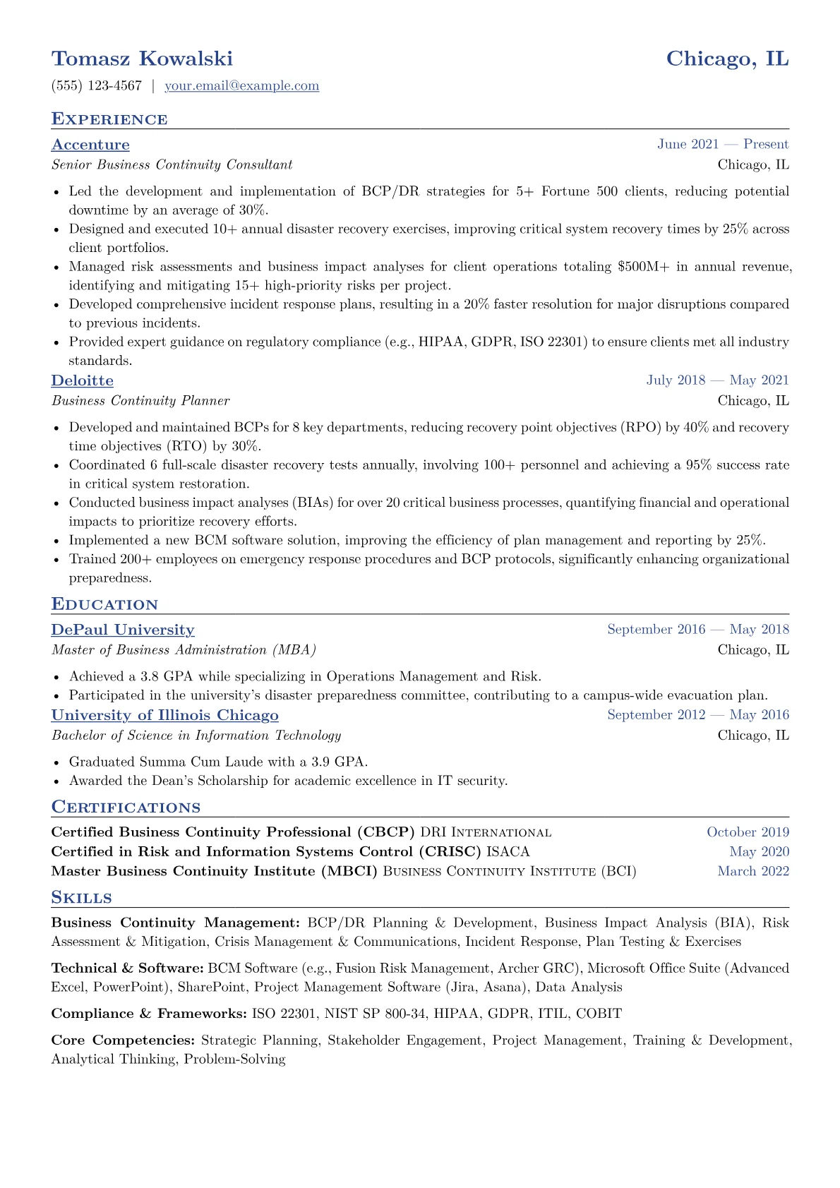 Hiring managers in consulting seek Business Continuity Planners who demonstrate a proactive approach to risk mitigation and the ability to strategize across diverse client environments. A strong resume highlights not just planning, but also the execution and measurable impact of continuity strategies, crucial for navigating the varied operational challenges inherent in consulting.