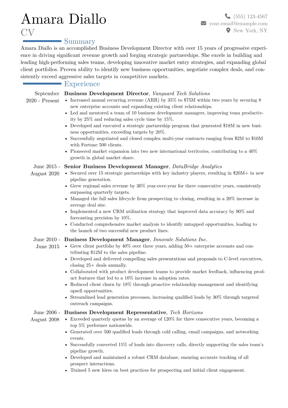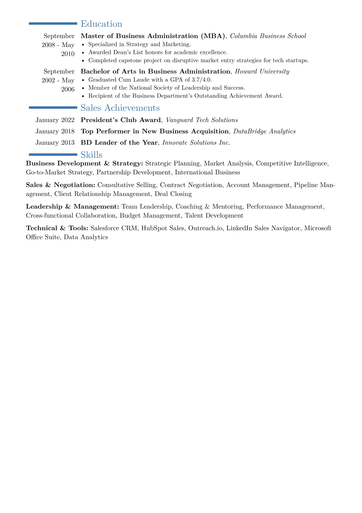 This example CV excels at presenting a clear narrative of executive-level business expansion. Achievements are robustly quantified, for instance, detailing specific year-over-year revenue growth percentages from new ventures or the multi-million dollar value of strategic alliances secured. Skills are thoughtfully grouped into categories like "Market Entry & Expansion," "Strategic Alliance Management," and "Complex Deal Negotiation," providing immediate insight into expertise. Crucially, the resume highlights proficiency in essential tools such as major CRM platforms and market intelligence software, alongside any relevant executive education or strategic leadership certifications.