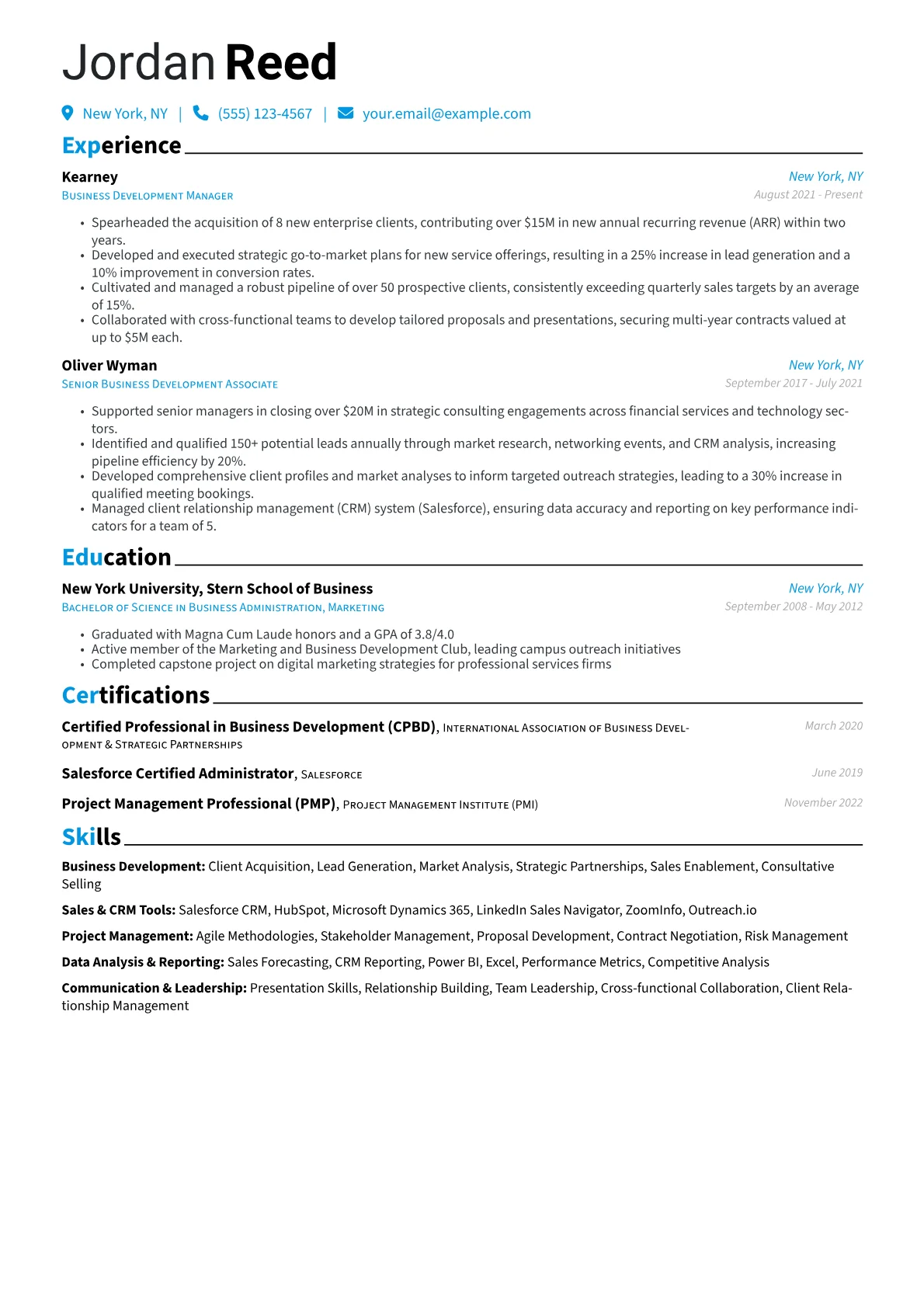 For Business Development Managers in consulting, a compelling resume effectively showcases quantifiable impact on revenue growth, client acquisition, and strategic relationship building. Hiring managers seek a proven ability to identify new market opportunities and close complex consulting deals. The unique challenge is demonstrating both sales acumen and a deep consultative understanding of client needs.
