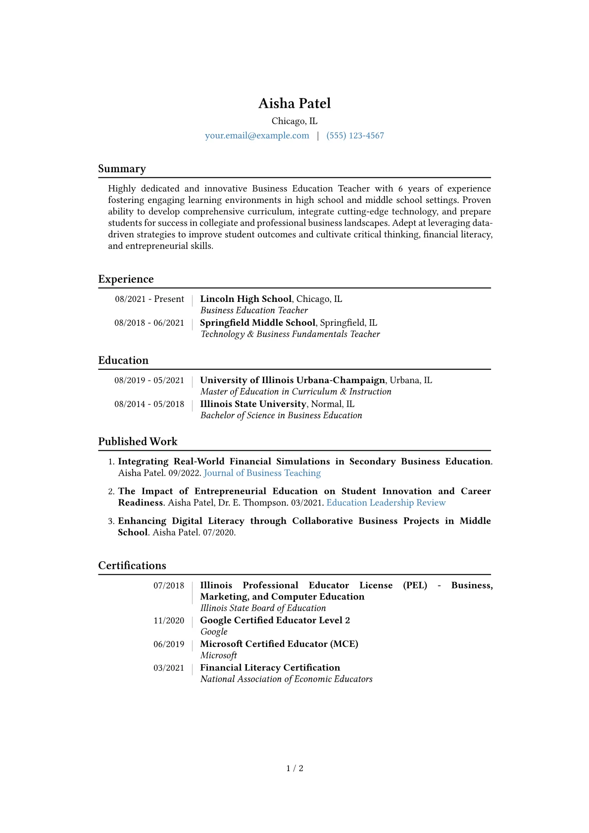 A strong Business Education Teacher resume effectively showcases a candidate's ability to bridge academic learning with practical business skills, crucial for mid-level roles in education. Hiring managers prioritize demonstrable experience in curriculum development for subjects like entrepreneurship, marketing, financial literacy, or accounting. Concrete achievements should include quantifiable student outcomes, such as improved scores on business simulations, successful student-led projects, or increased participation in career readiness programs like FBLA or DECA. Relevant certifications, including Microsoft Office Specialist (MOS), QuickBooks, or industry-specific tools, are vital, alongside familiarity with CTE standards and pedagogical approaches for vocational education.