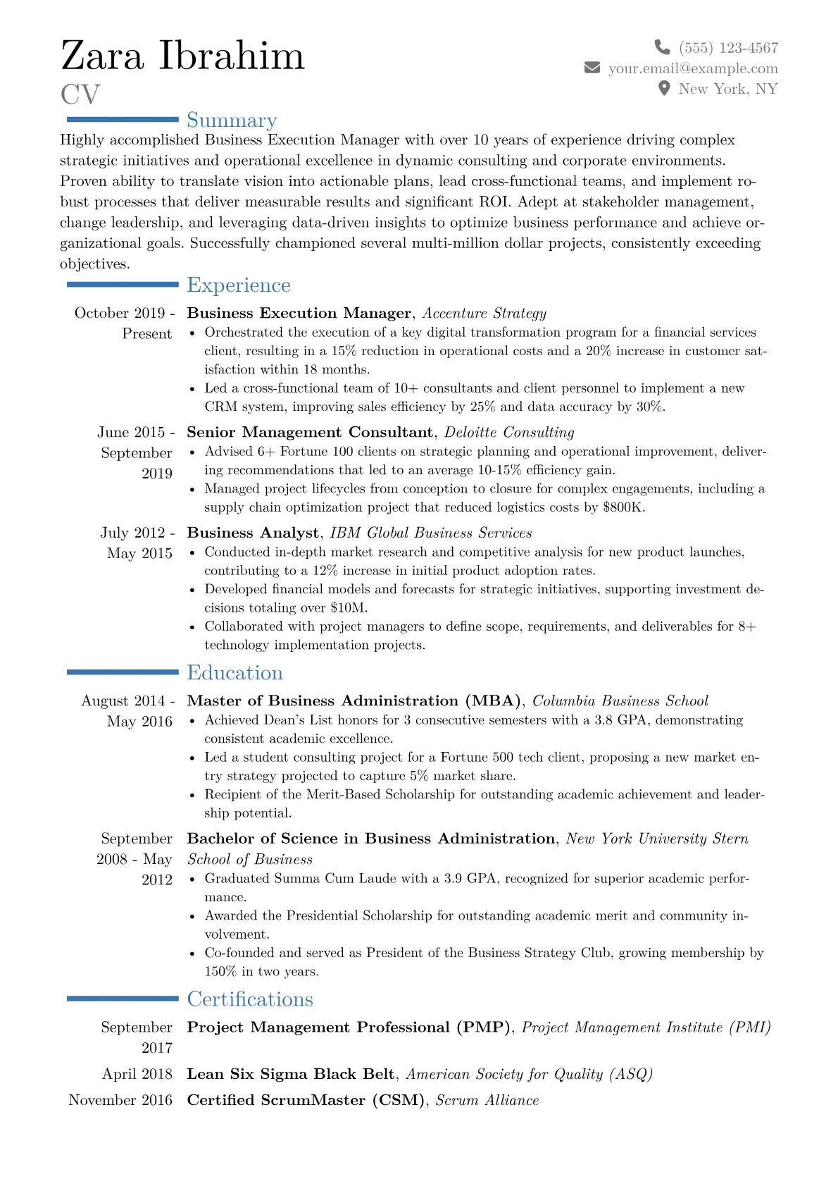 For a Business Execution Manager in Consulting, a resume must showcase more than just project delivery; it needs to highlight transformational impact. Hiring managers seek concrete examples of leading complex operational initiatives, driving client value through process re-engineering, and delivering measurable performance improvements. Key achievements often detail quantified cost reductions, efficiency gains, or revenue growth, frequently within a client engagement context. Certifications like Lean Six Sigma Black Belt or PMP are highly valued, indicating a structured approach to problem solving and execution leadership.