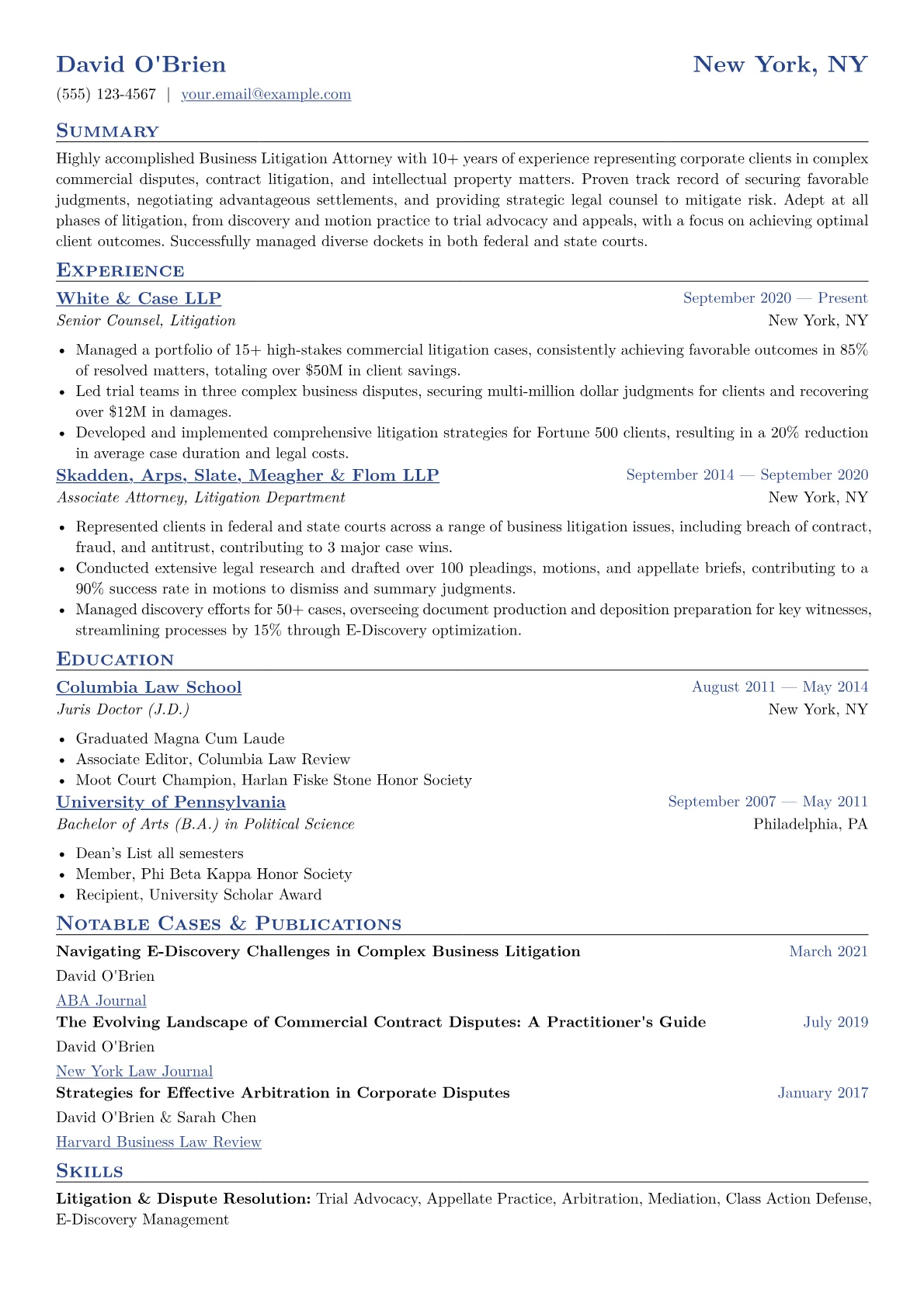 This example CV excels by structuring achievements with tangible metrics, detailing specific case outcomes and the financial impact of their work. Skills are thoughtfully grouped into relevant categories such as "Trial Advocacy," "Complex Commercial Litigation," and "eDiscovery Management," clearly communicating core competencies. Bar admissions, particularly to federal appellate courts, are prominently displayed, alongside any relevant legal technology proficiencies. The layout effectively highlights a senior attorney's ability to navigate high-stakes business disputes, demonstrating a clear progression of responsibility and success in managing diverse client portfolios.