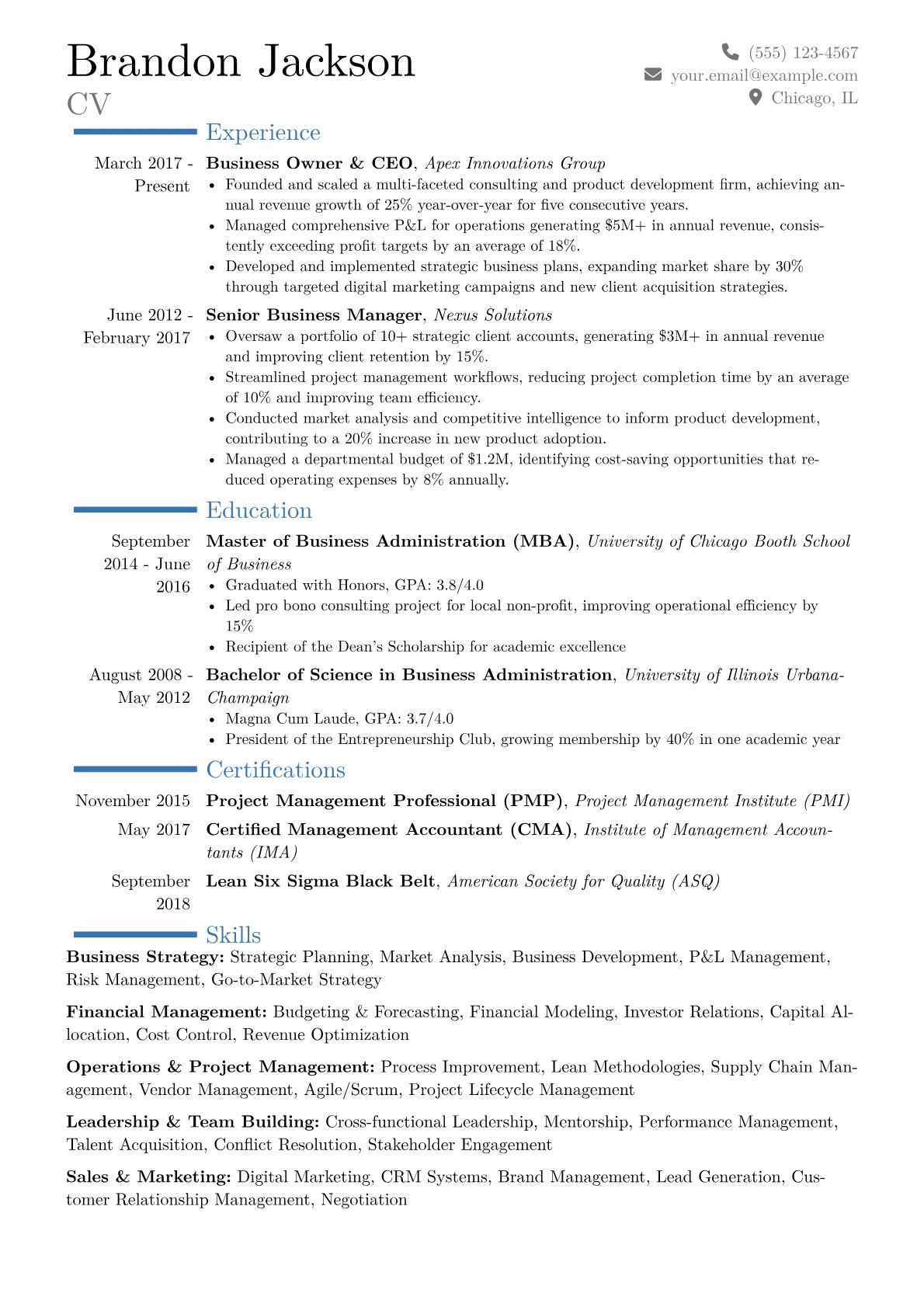 This example excels at reframing holistic ownership into a targeted Operations narrative. It skillfully employs quantified achievements, showcasing specific improvements in efficiency, cost reduction, or revenue growth, rather than just listing duties. The logical skills grouping highlights transferable expertise in areas like supply chain, project management, and process improvement, directly addressing what an Operations-focused hiring manager would value.