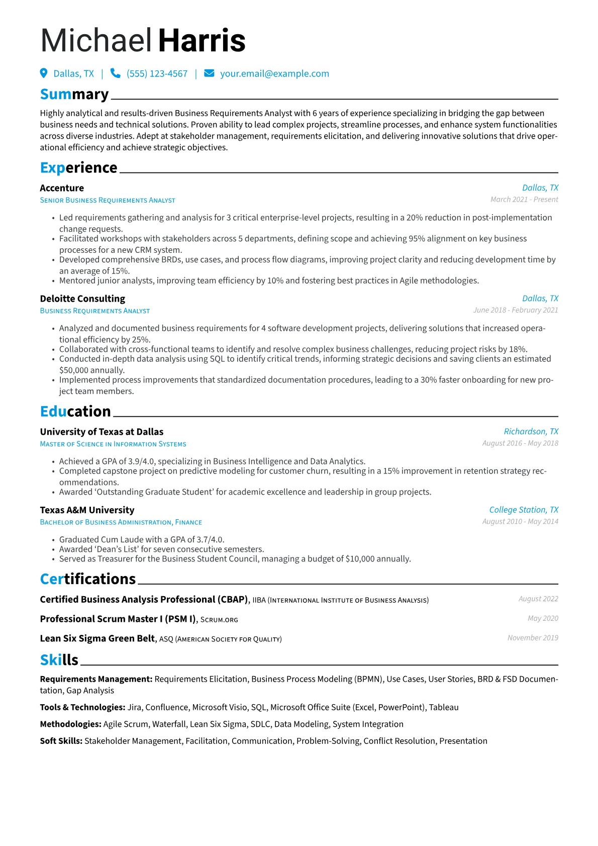 This example CV excels by featuring achievements that clearly quantify project impact, for instance, detailing specific percentage reductions in operational costs or improvements in process cycle times. Skills are strategically grouped into "Business Analysis Tools and Techniques," "Project Methodologies," and "Technical Skills," making the candidate's core competencies immediately apparent. Crucially, relevant certifications and proficiency with industry standard tools like Jira, Confluence, and process mapping software are prominently highlighted, catering directly to consulting requirements.