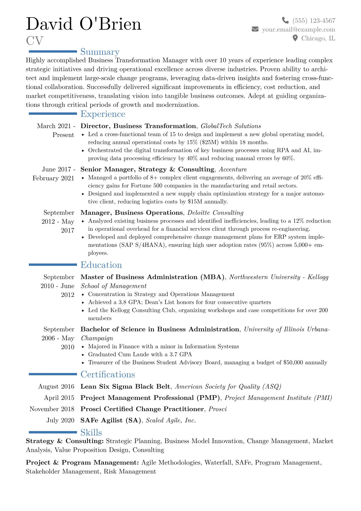This template was built with JobSprout and can be remixed to create your own tailored Business Transformation Manager resume.