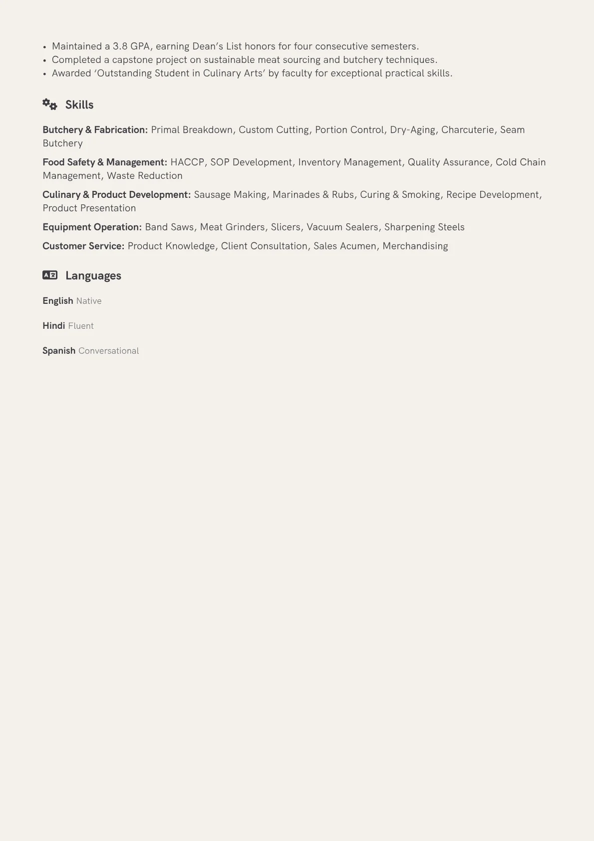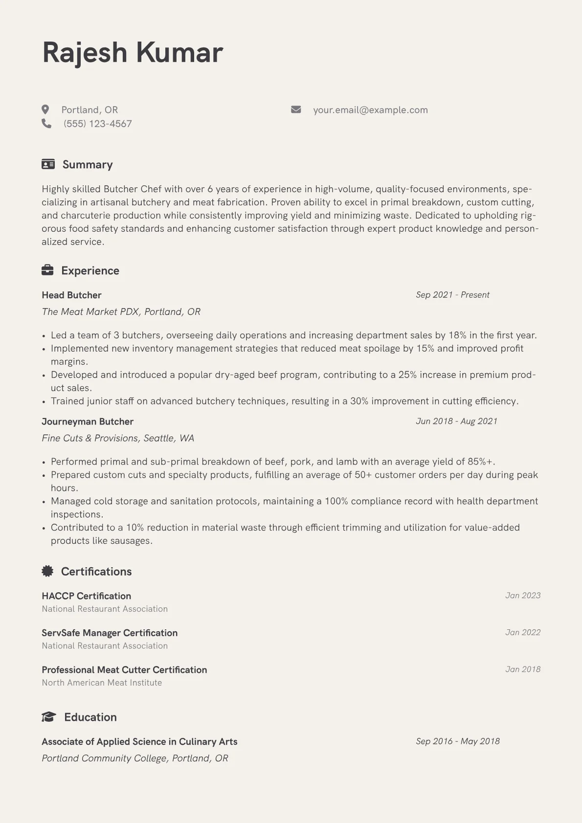 This template was built with JobSprout and can be remixed to create your own tailored Butcher Chef resume. It provides a robust framework to highlight your unique qualifications and career aspirations.