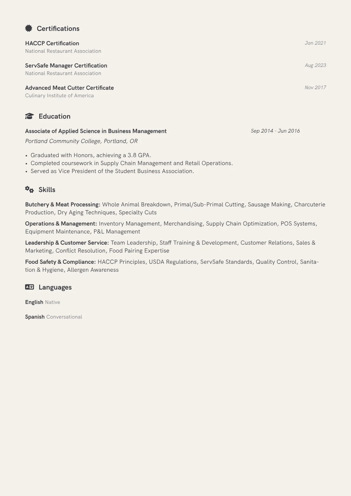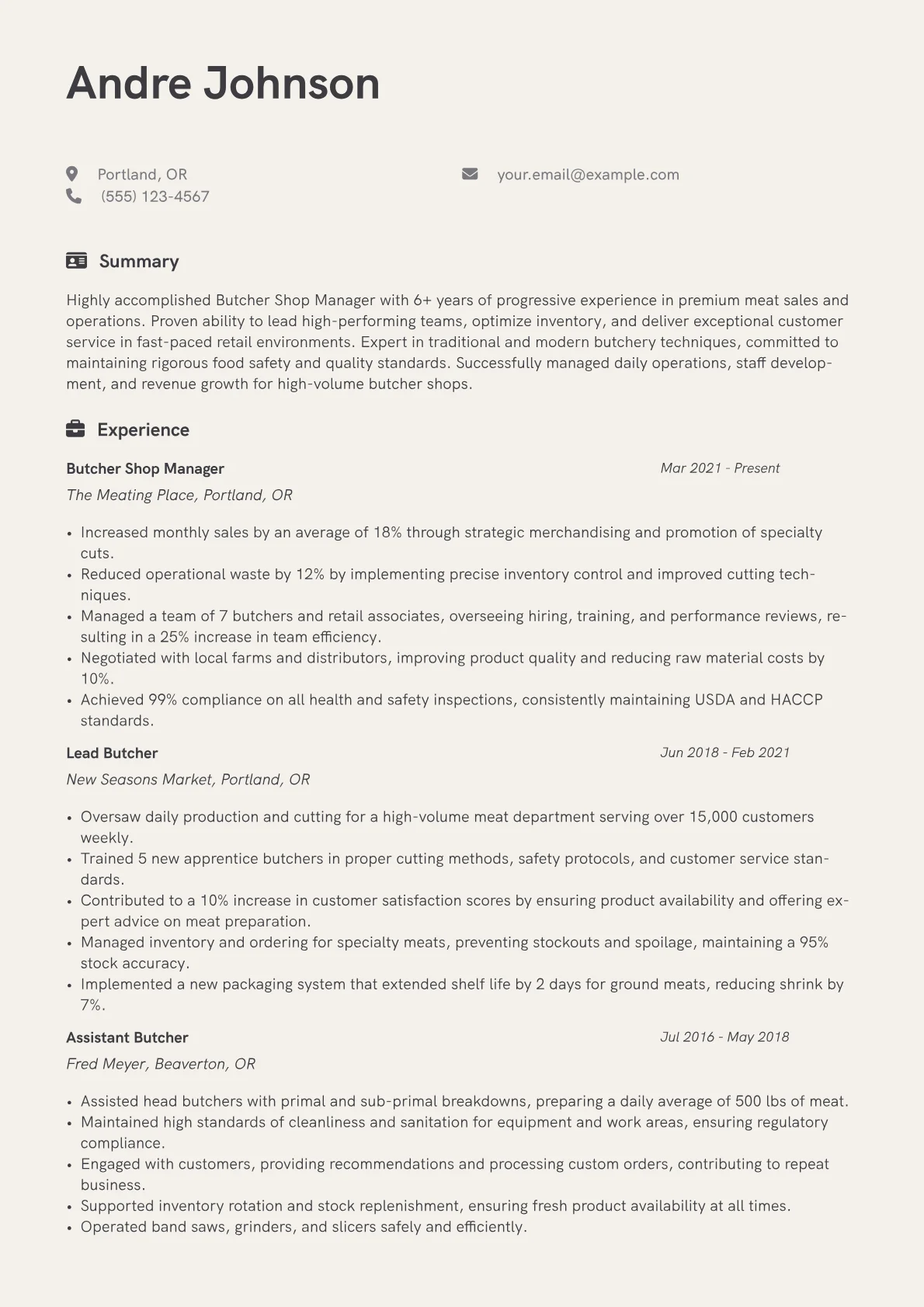 This template was built with JobSprout and can be remixed to create your own tailored Butcher Shop Manager resume.