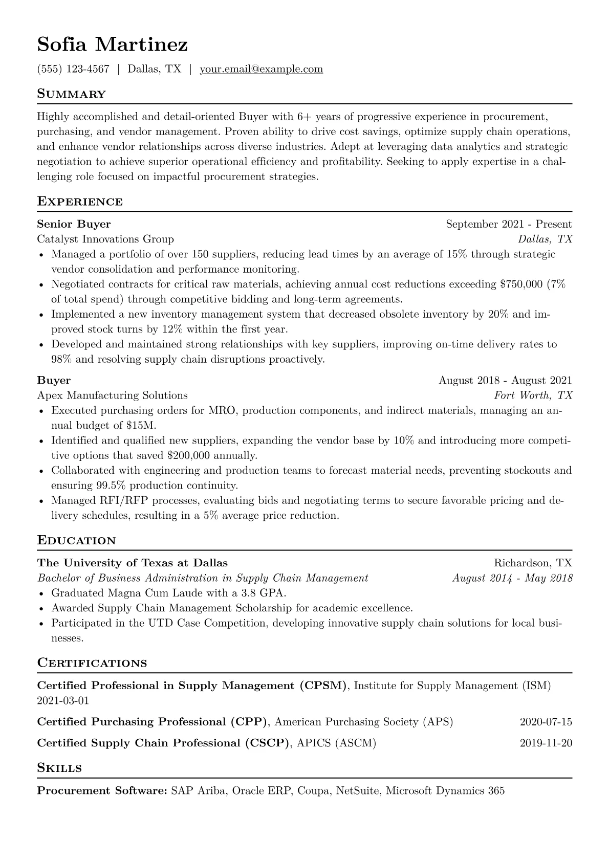 This example CV excels by concretely quantifying achievements, presenting a clear picture of the Buyer's capabilities. It highlights cost savings and efficiency gains with specific percentages and dollar amounts, rather than vague statements. Key skills are logically grouped, emphasizing areas like strategic sourcing, vendor management, and contract negotiation. Furthermore, the resume effectively showcases relevant technical proficiencies, such as specific ERP systems or data analysis tools, which are critical for navigating complex purchasing environments.