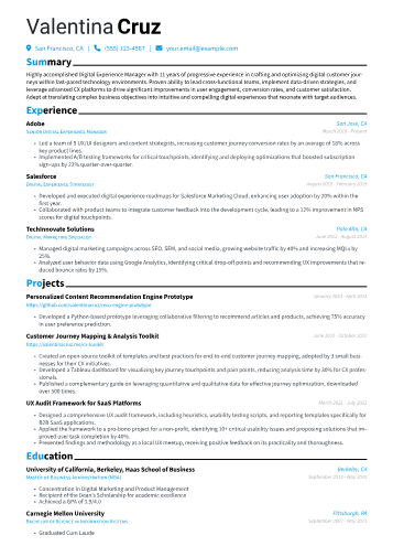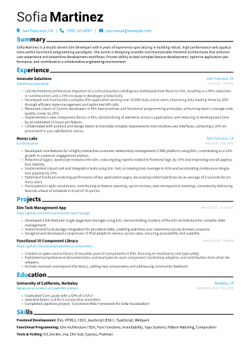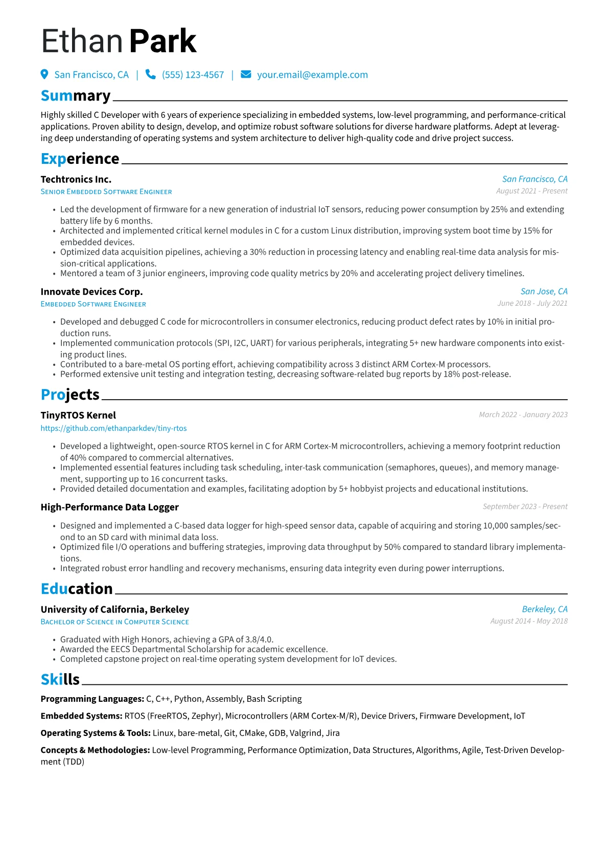 This example CV effectively showcases these specialized skills. Its structured approach clearly groups technical proficiencies, dedicating distinct sections to C/C++ specific libraries, operating systems like Linux kernel, and critical tools such as Valgrind and CMake. Achievements are precisely quantified, detailing contributions like "optimized kernel module performance, reducing processing time by 15%." This specificity demonstrates real-world impact and expertise in areas critical for C development, including real-time systems and inter-process communication.