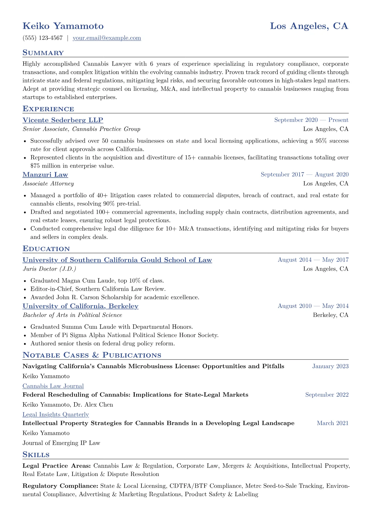 This resume example excels by strategically quantifying achievements, illustrating a clear impact on client operations or compliance outcomes. For instance, specific license types secured or the scale of multi-state operations advised are clearly articulated. Skills are thoughtfully grouped into relevant areas like "Regulatory Compliance," "Corporate Structuring," and "Litigation," providing an immediate overview of a candidate’s breadth of expertise. Furthermore, bar admissions in key cannabis-friendly states and specialized cannabis law certifications are prominently highlighted, showcasing direct relevance to the role.