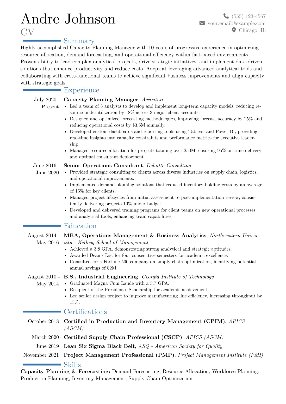 This example CV excels by clearly quantifying each professional accomplishment, demonstrating the direct impact of capacity planning initiatives. Achievements are presented with metrics such as percentage increases in utilization or reductions in project delays. Skills are effectively grouped to highlight both technical expertise in tools like Anaplan or Tableau, alongside critical consulting competencies such as stakeholder communication and change management. Certifications and relevant project management or analytical tools are prominently displayed, assuring recruiters of a candidate's readiness to tackle complex consulting challenges.