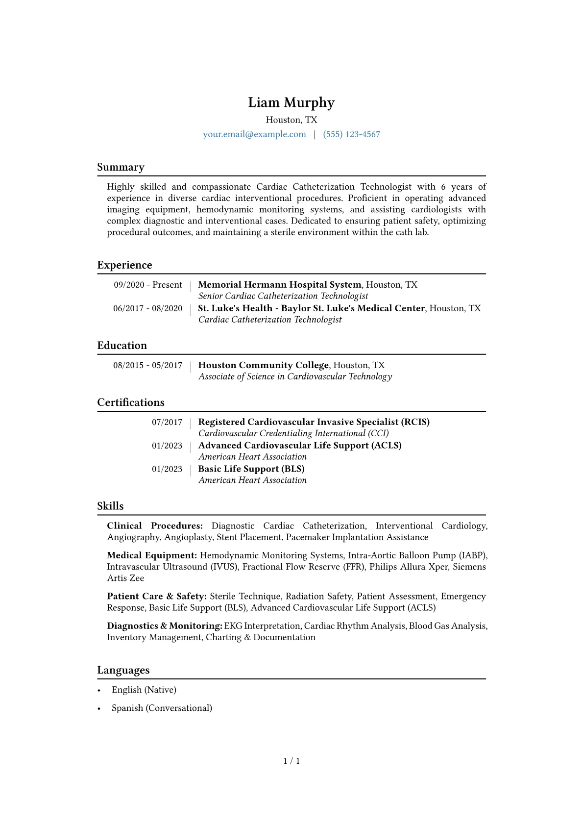 This template was built with JobSprout and can be remixed to create your own tailored Cardiac Catheterization Technologist resume.