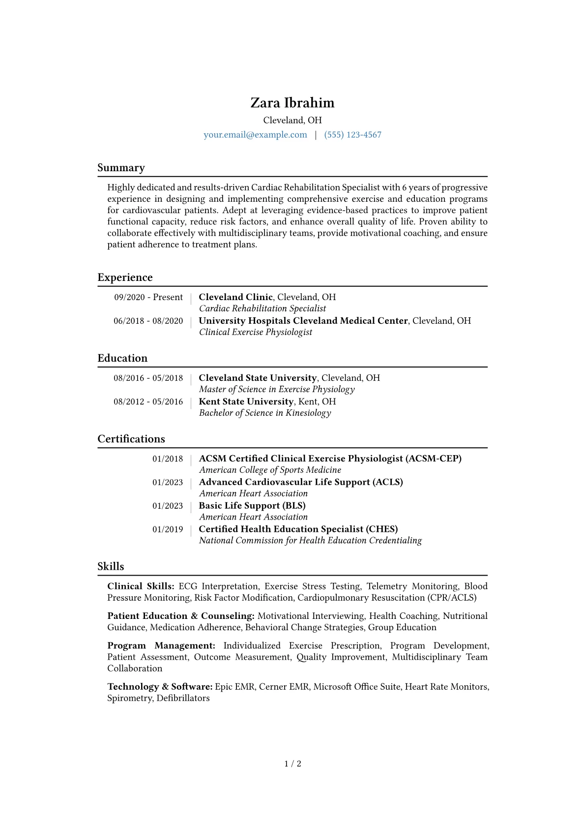 This example CV effectively highlights a mid-level specialist's capabilities. Achievements are clearly quantified, for instance, detailing percentages of reduced readmissions or improvements in patient outcome metrics. Clinical skills, such as telemetry monitoring and stress testing, are distinctly grouped from patient counseling abilities, like nutrition and medication management education. Prominent placement of critical certifications and proficiency with relevant EMR systems like Epic further demonstrates industry-specific competency, directly addressing what cardiac rehabilitation programs require.