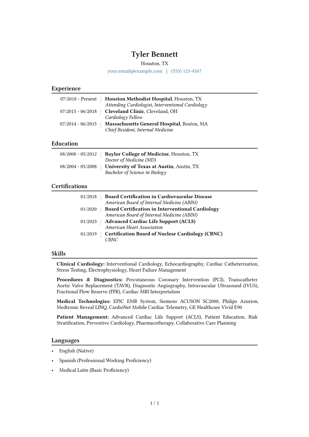 This template was built with JobSprout and can be remixed to create your own tailored Cardiologist resume. Customize it to reflect your unique experience and career goals.