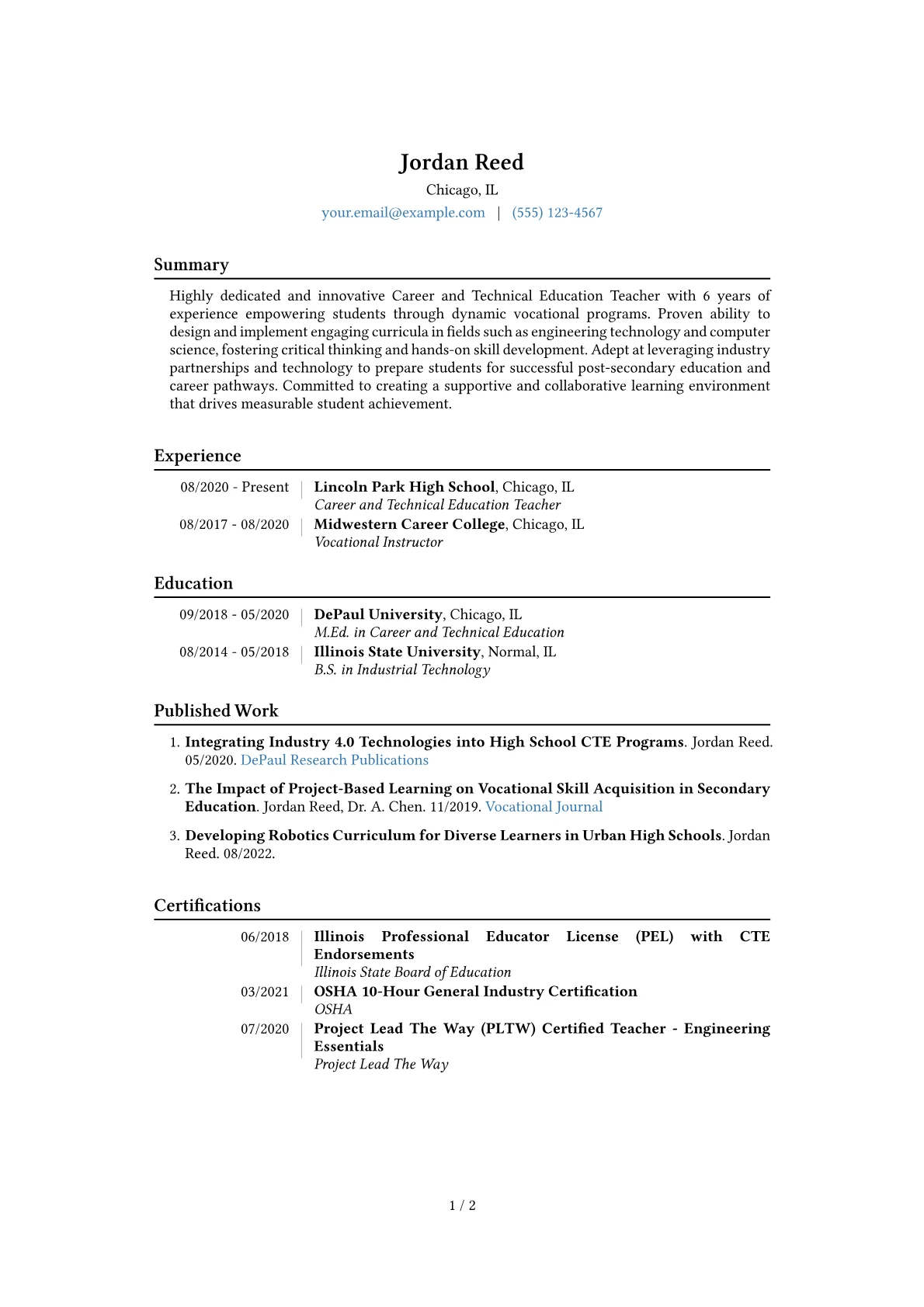 This template was built with JobSprout and can be remixed to create your own tailored Career and Technical Education Teacher resume.