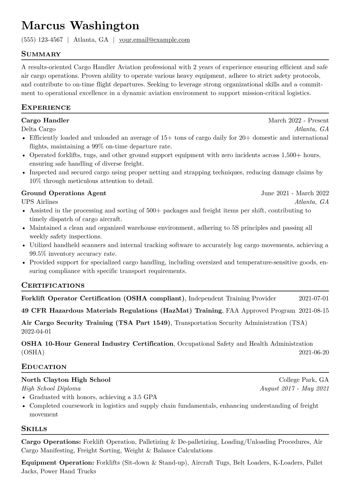 For an entry-level Cargo Handler Aviation role, hiring managers prioritize resumes demonstrating a strong commitment to safety, physical capability, and procedural adherence. They seek concrete examples of efficiency in time-sensitive environments and the ability to operate ground support equipment. Key achievements might include consistently meeting turnaround times for loading and unloading, minimizing cargo damage, or contributing to a zero-incident safety record. Mentioning specific certifications like Forklift Operator or OSHA 10, alongside familiarity with terminology such as ULD handling, manifest verification, and ramp operations, signals a candidate's readiness for the highly regulated aviation logistics sector.