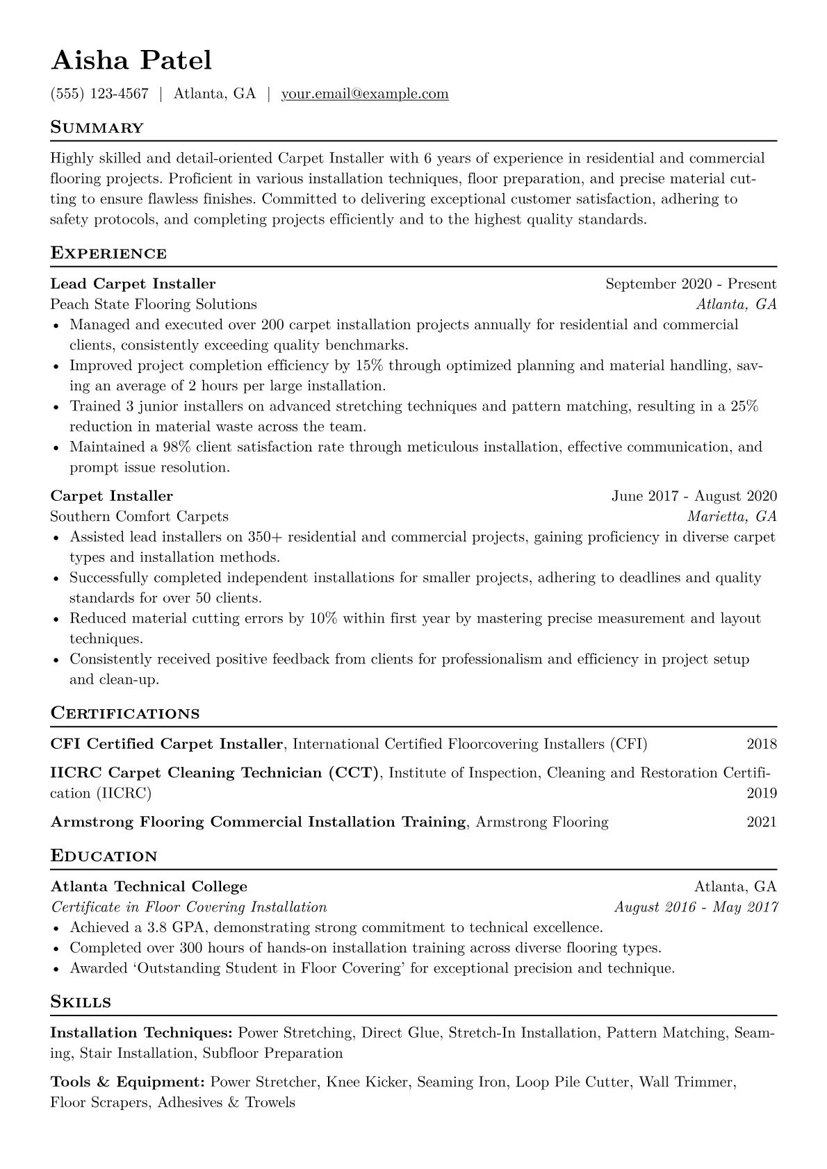This template was built with JobSprout and can be remixed to create your own tailored Carpet Installer resume.
