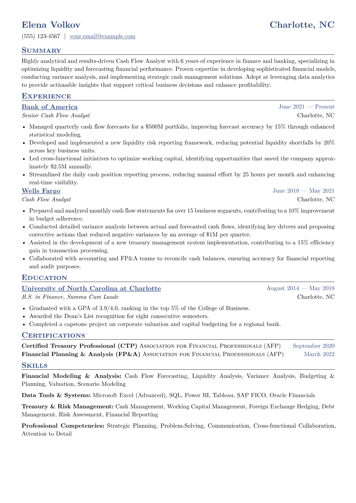 For a mid-level Cash Flow Analyst in Finance & Banking, hiring managers prioritize precision in financial forecasting and liquidity management. They seek candidates who can demonstrate tangible impact on working capital optimization and cash conversion cycles. Key achievements should reflect improved forecast accuracy, reduced variance, and effective risk mitigation. Familiarity with ERP systems like SAP FICO or Oracle ERP, alongside advanced Excel modeling and knowledge of GAAP/IFRS reporting, is crucial. Terminology such as "direct and indirect cash flow methods" or "debt covenant compliance" also resonates strongly.