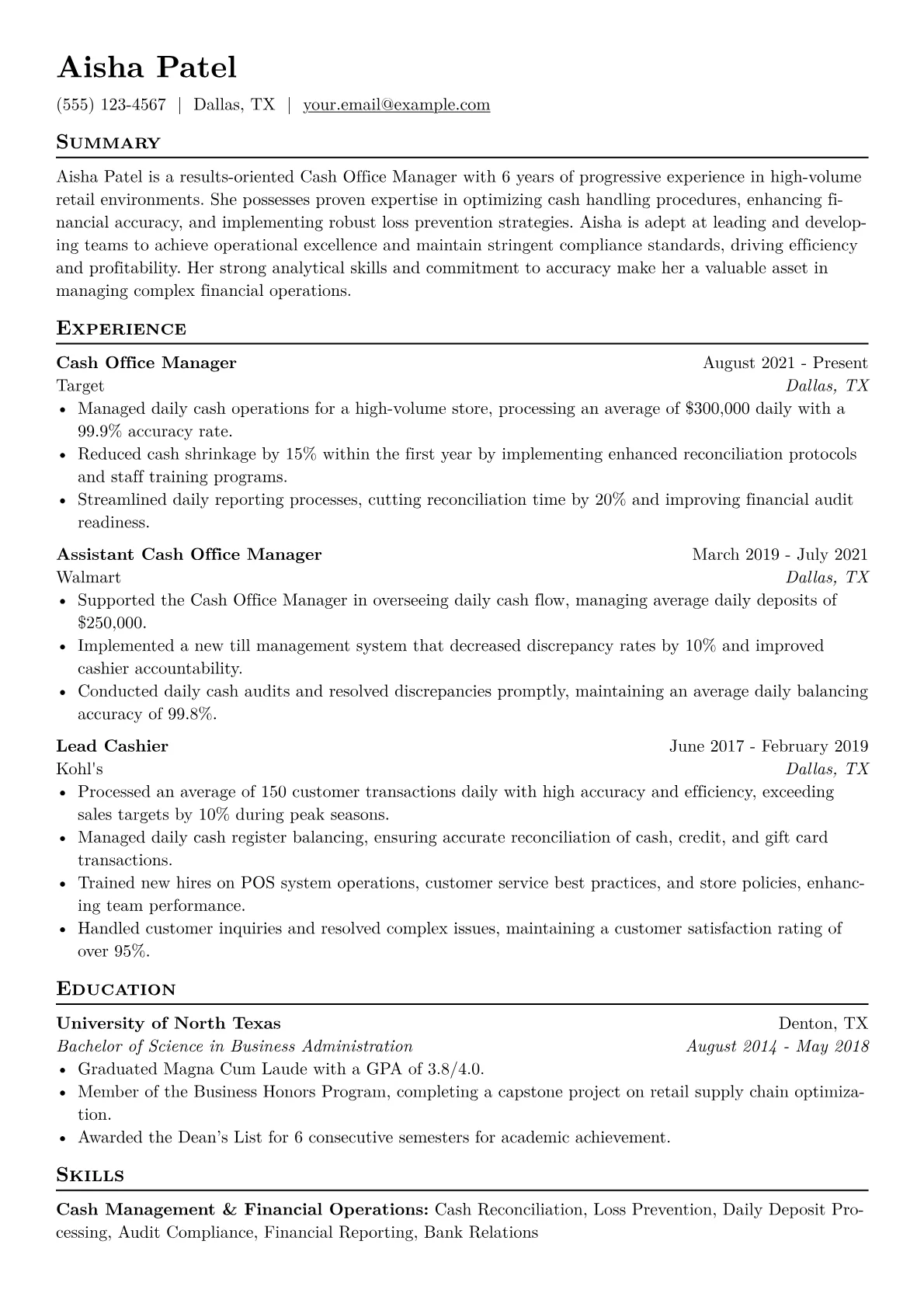 This JobSprout example effectively emphasizes these critical areas. Achievements are precisely quantified, for instance, showcasing "reduced daily cash variances by 15% across 10 tills" or "improved monthly audit compliance scores by 10%." Skills are thoughtfully grouped under relevant headings such as "Financial Operations & Reconciliation" and "Loss Prevention & Team Supervision," explicitly listing tools like "NetSuite," "Square POS," and "Cash Management Software." This clear structure ensures hiring managers quickly grasp the candidate's capabilities.