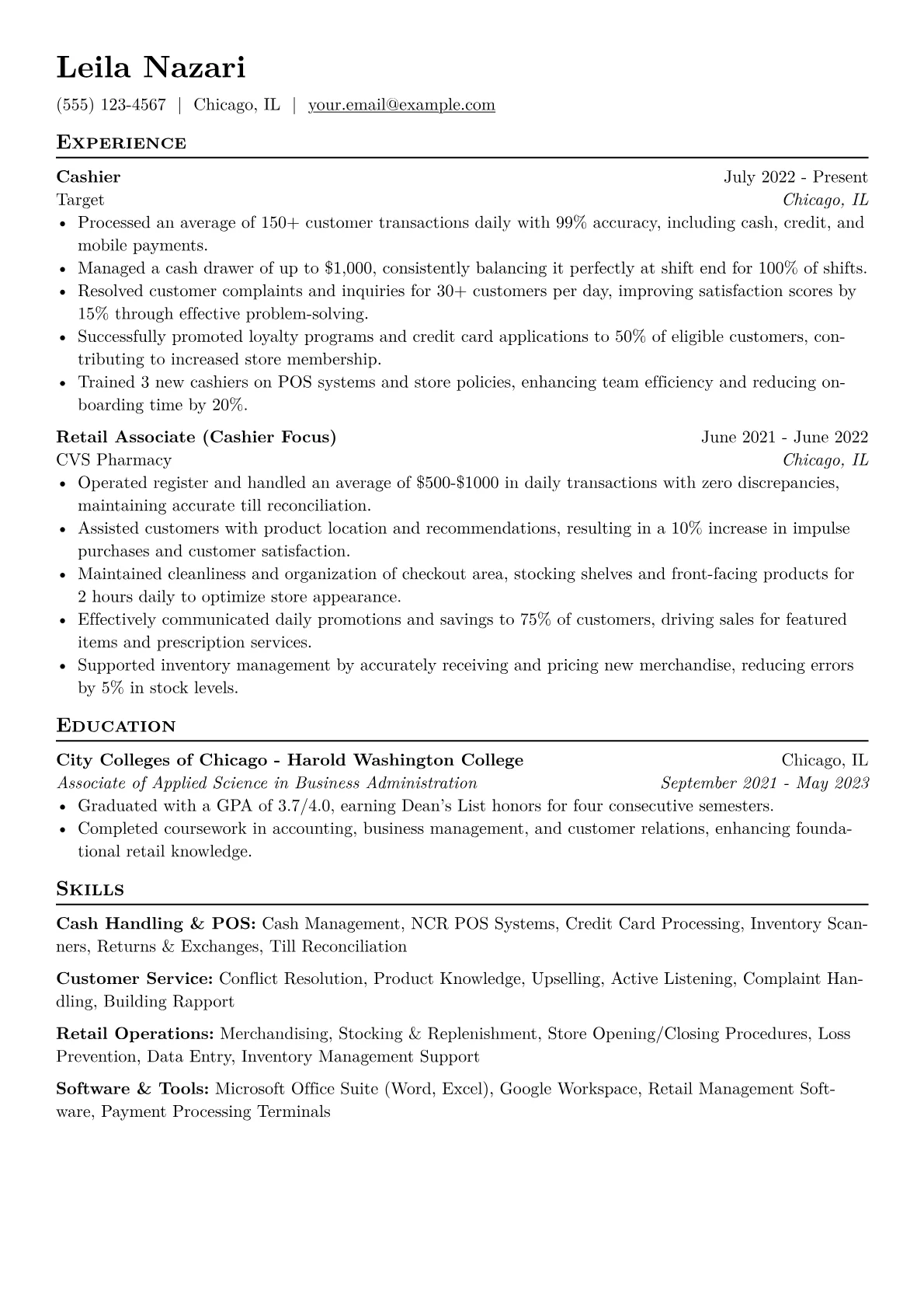 A strong Cashier resume in Retail & E-commerce highlights both precision and people skills. Hiring managers specifically look for candidates who can efficiently manage high transaction volumes with accuracy, often exceeding 98%. Emphasizing achievements like minimizing wait times, processing returns smoothly, or successfully enrolling customers in loyalty programs demonstrates value. Concrete details about proficiency with various Point of Sale (POS) systems, experience handling cash and card payments securely, and contributing to a positive shopping experience are crucial, showcasing readiness for the fast-paced retail environment.