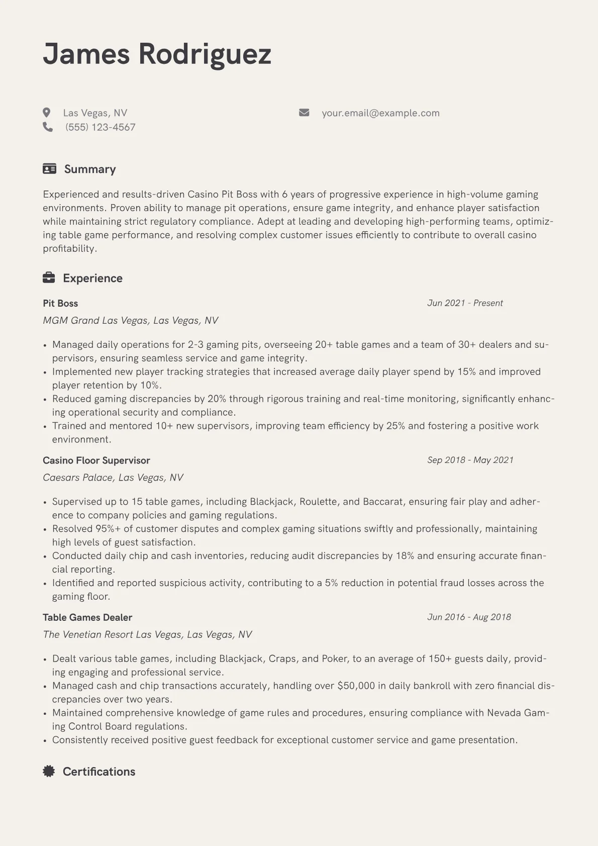 This template was built with JobSprout and can be remixed to create your own tailored Casino Pit Boss resume. JobSprout offers powerful tools to adapt this structure for your unique professional background.