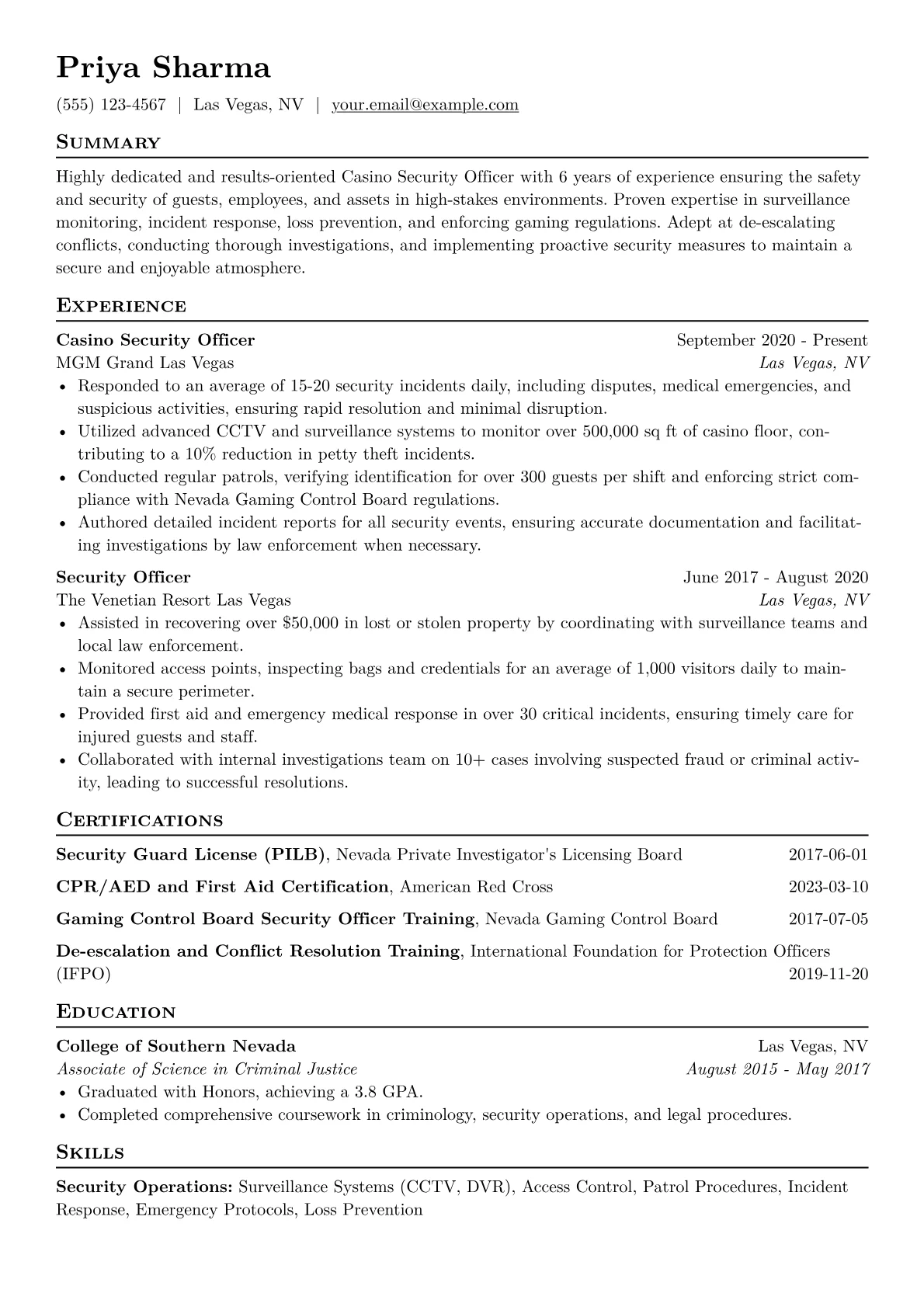 This template was built using JobSprout and offers a robust framework. It can be easily customized to craft your own tailored Casino Security Officer resume.