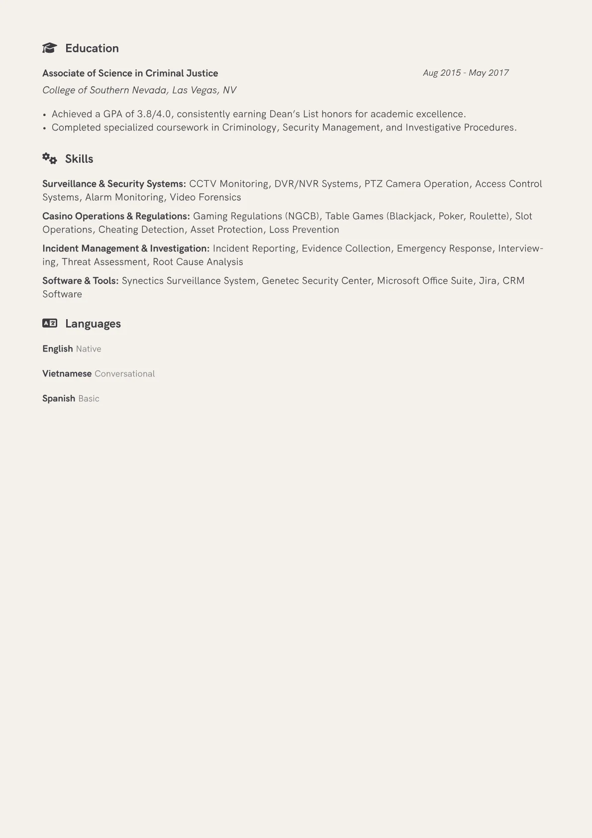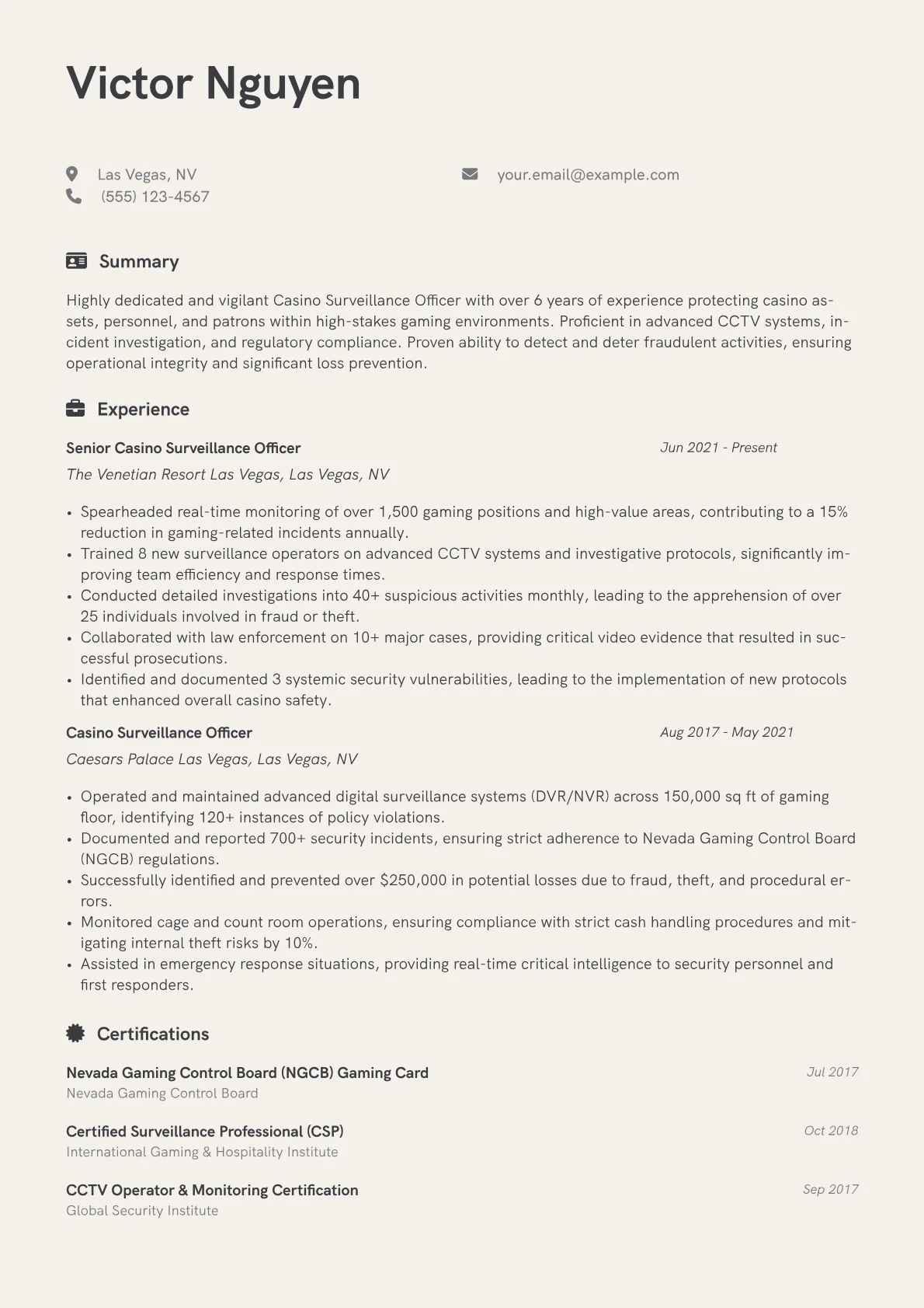 This example CV excels by structuring content to address these precise needs. Achievements are clearly quantified, such as "Identified X instances of chip manipulation, preventing Y in potential losses over Z months." Skills are strategically grouped, separating technical proficiencies like specific surveillance software (e.g., Avigilon, Genetec) and access control systems from critical soft skills like situational awareness and meticulous report writing. Furthermore, the resume effectively highlights industry-specific certifications and proficiency with relevant surveillance tools, ensuring key qualifications are immediately visible to recruiters.