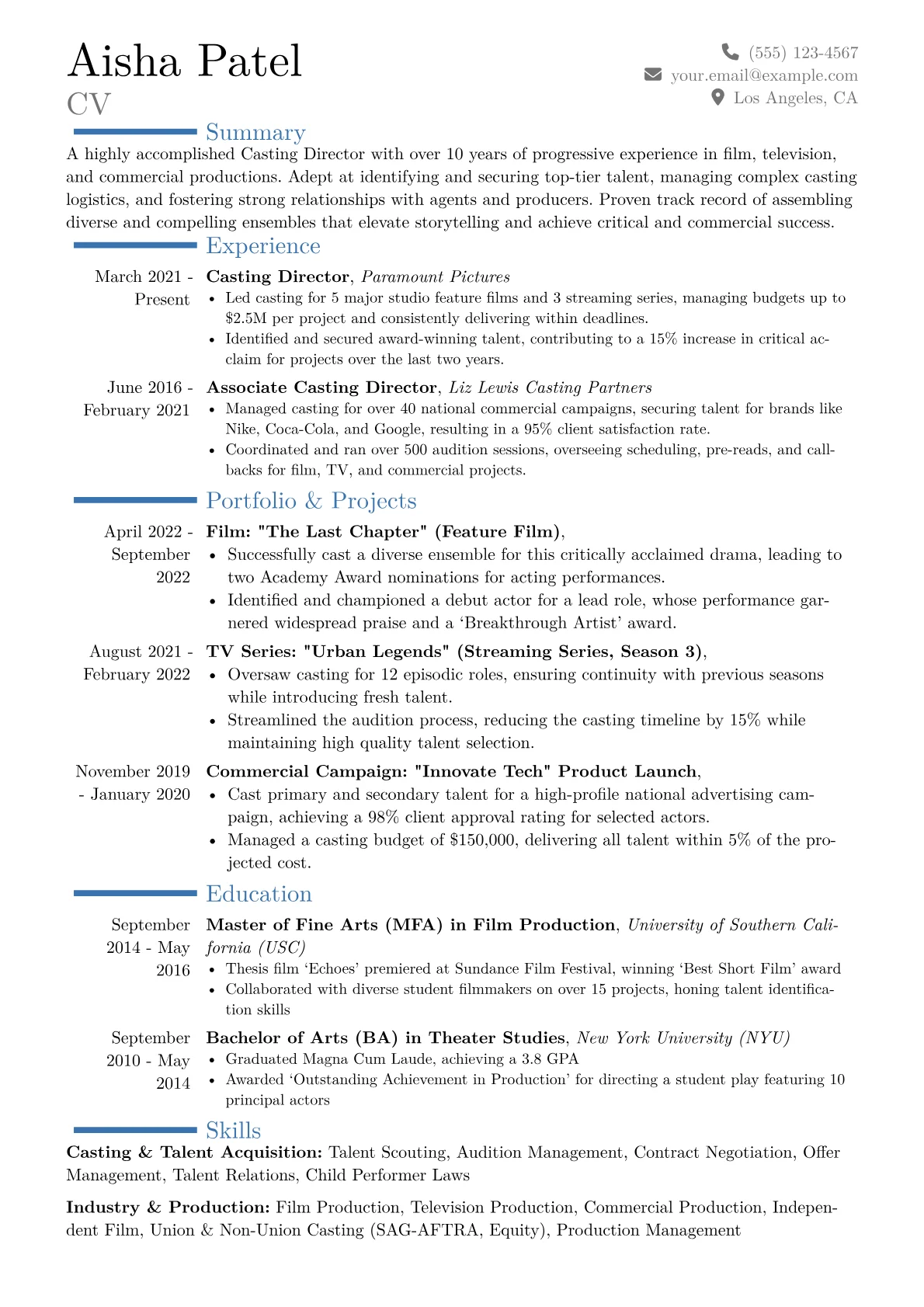 A compelling Casting Director resume in Media & Entertainment must highlight concrete achievements beyond merely listing projects. Hiring managers seek evidence of successful talent identification for diverse roles and genres, often noting budget adherence and the ability to discover untapped potential. Expertise in union regulations like SAG-AFTRA, proficiency with industry-standard platforms such as Breakdown Services and Casting Networks, and a demonstrated skill in negotiating offers are paramount. The best resumes detail contributions to acclaimed productions, showcasing impact through specific project titles and outcomes.