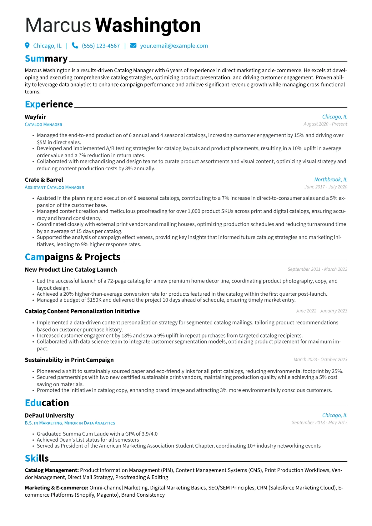 This template was built using JobSprout's tools, demonstrating its ability to highlight essential Catalog Manager qualifications. You can easily adapt this structure to showcase your unique experience and secure your next role.