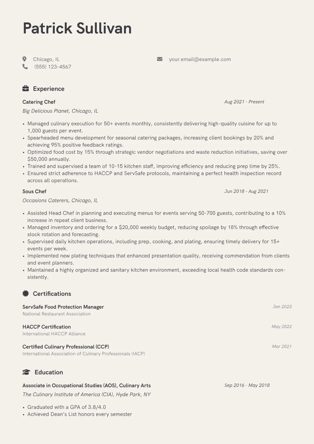 This particular JobSprout resume example excels by featuring clear, quantified achievements that demonstrate impact, like managing a specific number of events or improving kitchen efficiency. The structured skills section groups relevant culinary, management, and sanitation competencies, immediately showing a well-rounded professional. Furthermore, including relevant certifications reinforces a commitment to industry standards and food safety, critical for any catering operation.