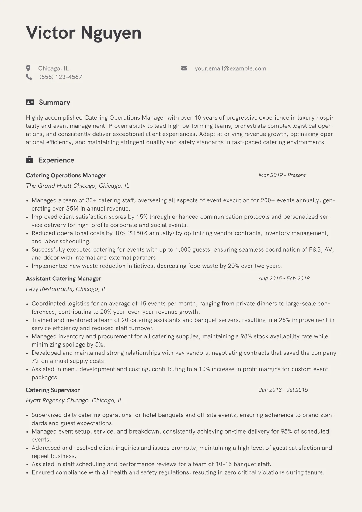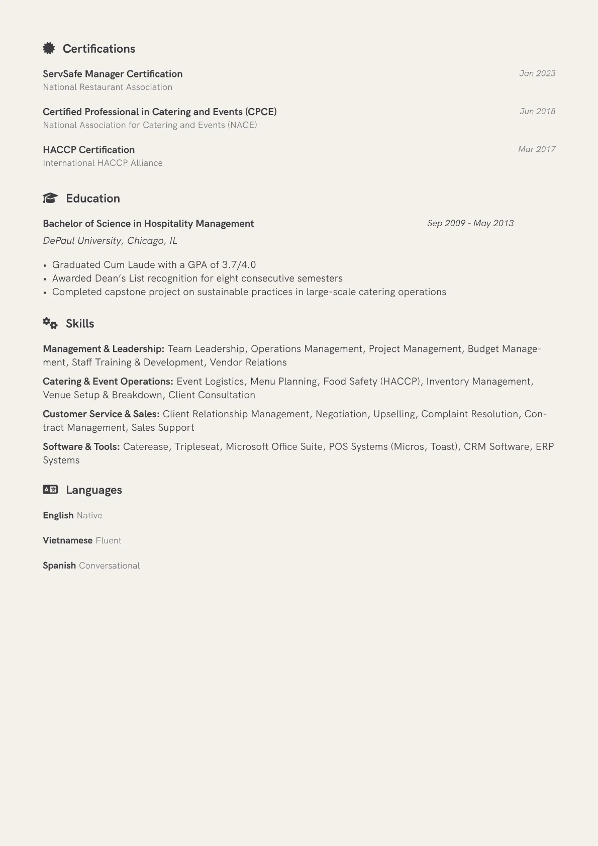 This template was built with JobSprout and can be remixed to create your own tailored Catering Operations Manager resume, ensuring all your unique strengths are highlighted.