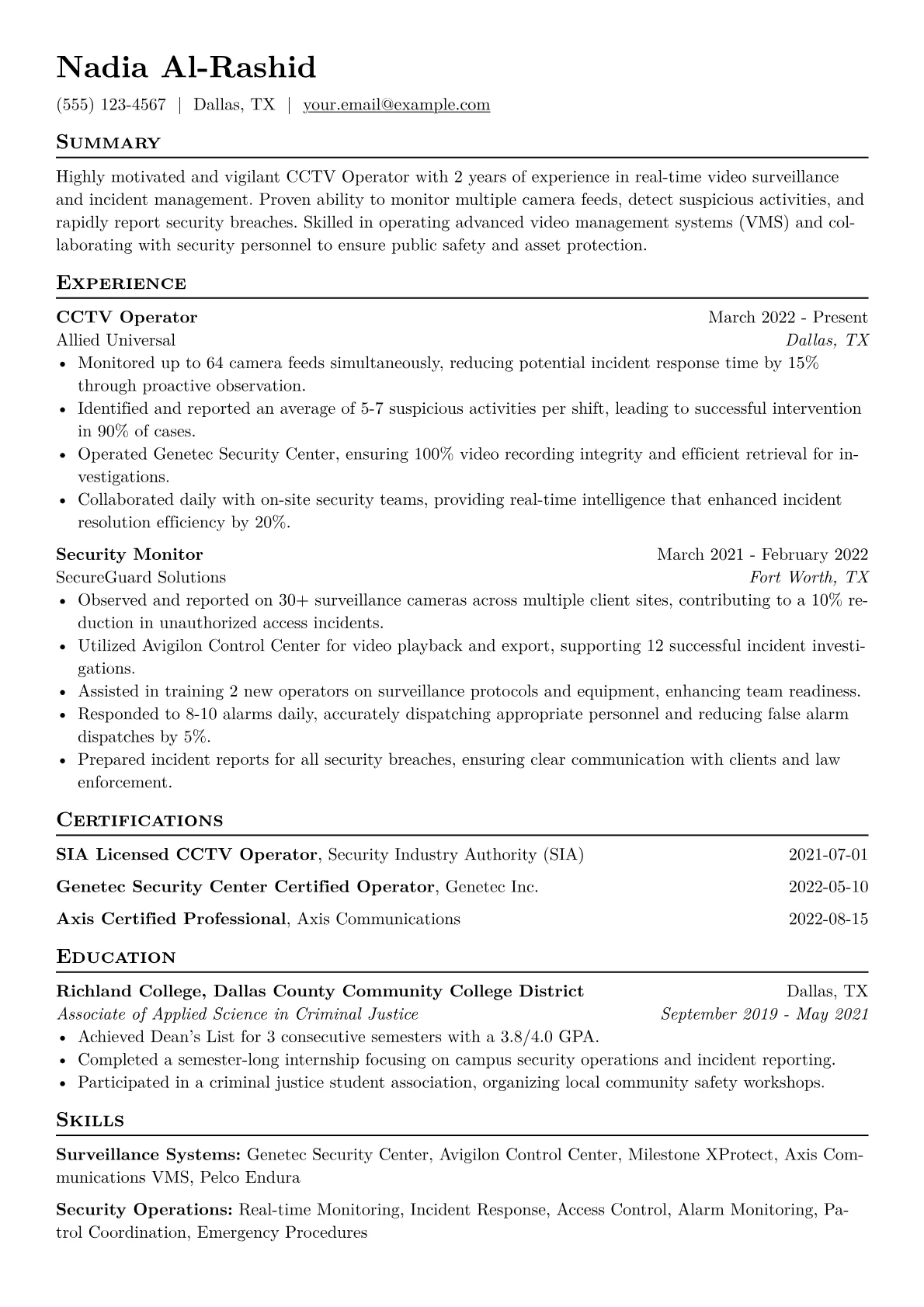 This example CV demonstrates best practices by clearly quantifying achievements, showcasing the direct impact of monitoring activities. Experience descriptions use action verbs to highlight responsibilities like incident reporting and detailed log keeping. Technical skills are distinctly grouped to feature proficiency with specific surveillance software and hardware, while soft skills, crucial for this role, are also effectively presented. Highlighting certifications and specific VMS platform experience provides immediate proof of capability and adherence to industry standards.