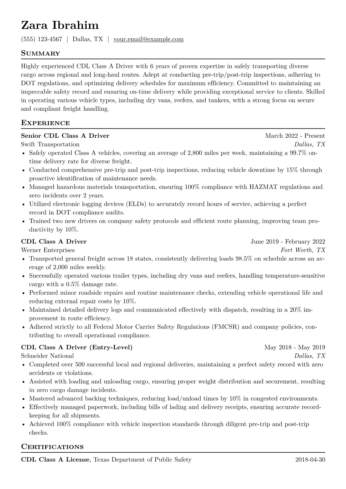 This template was built with JobSprout and can be remixed to create your own tailored CDL Class A Driver resume. It provides an excellent framework for presenting your qualifications.