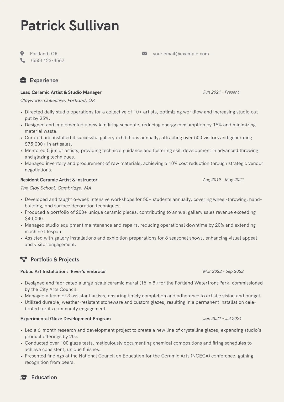 Crafting an impactful Ceramicist resume requires showcasing both artistic vision and practical expertise. Hiring managers in creative or specialized industries look for a strong portfolio, demonstrable technical skills, and the ability to manage projects from concept to completion. A key challenge is effectively translating creative output and artistic achievements into professional, quantifiable experiences.