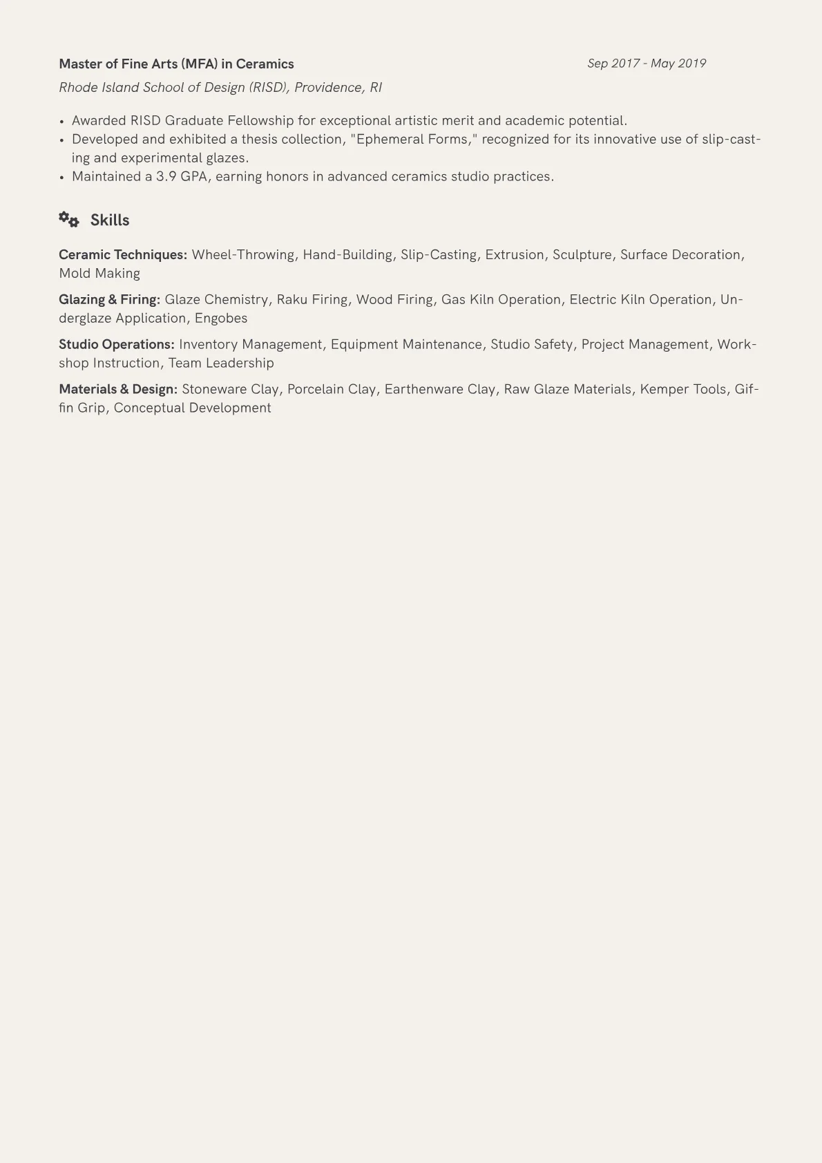 This JobSprout example excels by adeptly blending creative accomplishments with a professional structure. It thoughtfully highlights quantified achievements, such as studio output or exhibition participation, and meticulously groups essential skills like wheel-throwing, kiln operation, and glaze formulation. The inclusion of specific project examples further demonstrates comprehensive capability and professional growth.