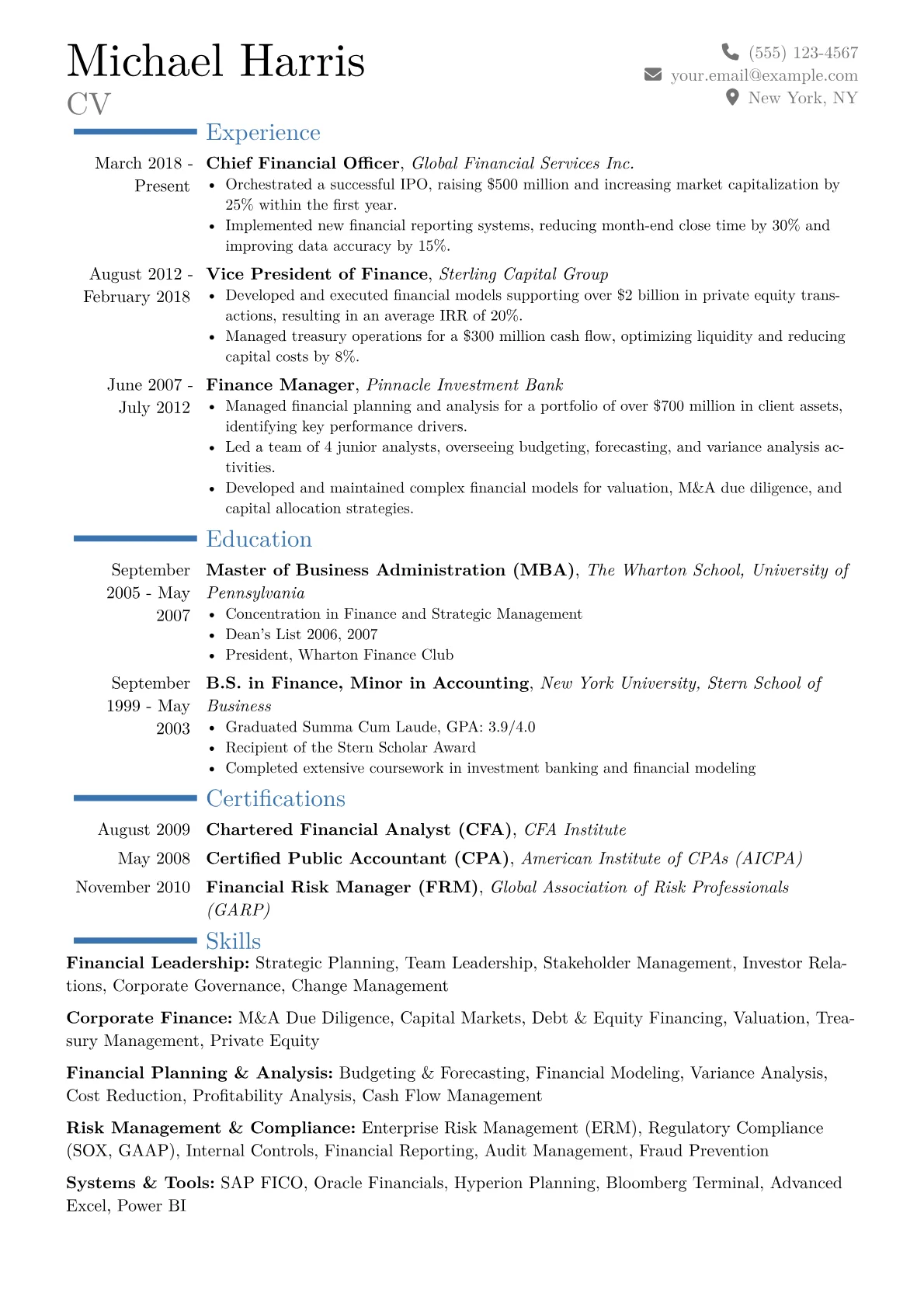 This exemplary template was thoughtfully created using JobSprout’s professional CV builder. Finance executives can easily remix this framework to craft their own compelling resume, tailored precisely to their career history and aspirations.