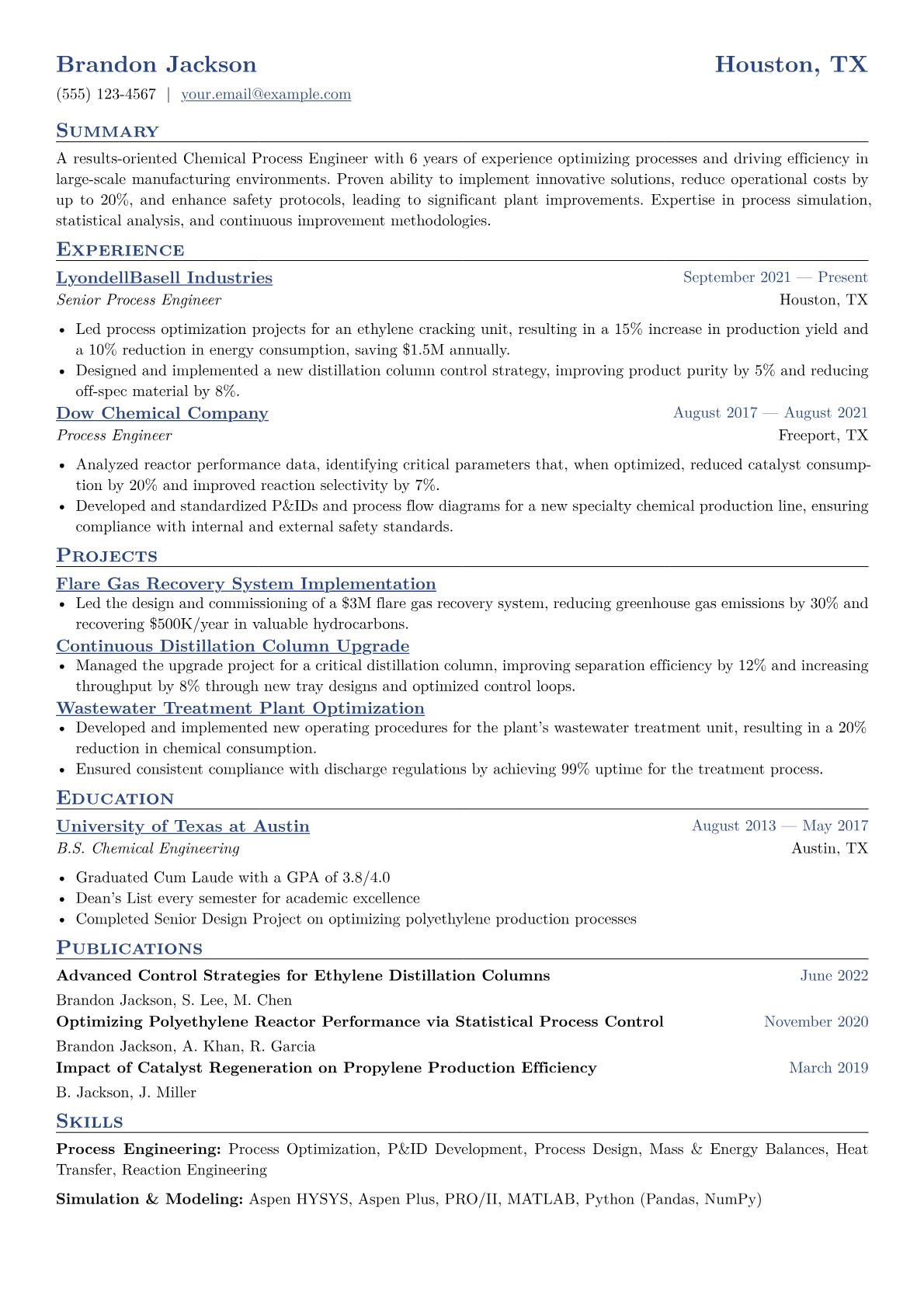 The featured resume template excels at showcasing these specific competencies. It strategically groups technical skills under clear headings like "Process Simulation," "Process Control," and "Safety & Compliance," making key qualifications immediately apparent. Achievements are consistently quantified, providing tangible evidence of impact rather than generic statements. Furthermore, the template dedicates prominent sections to highlight specific software proficiencies and relevant certifications, ensuring critical tools and industry-specific training are easily identifiable by hiring teams.