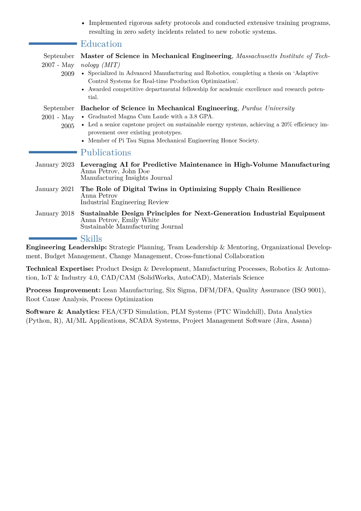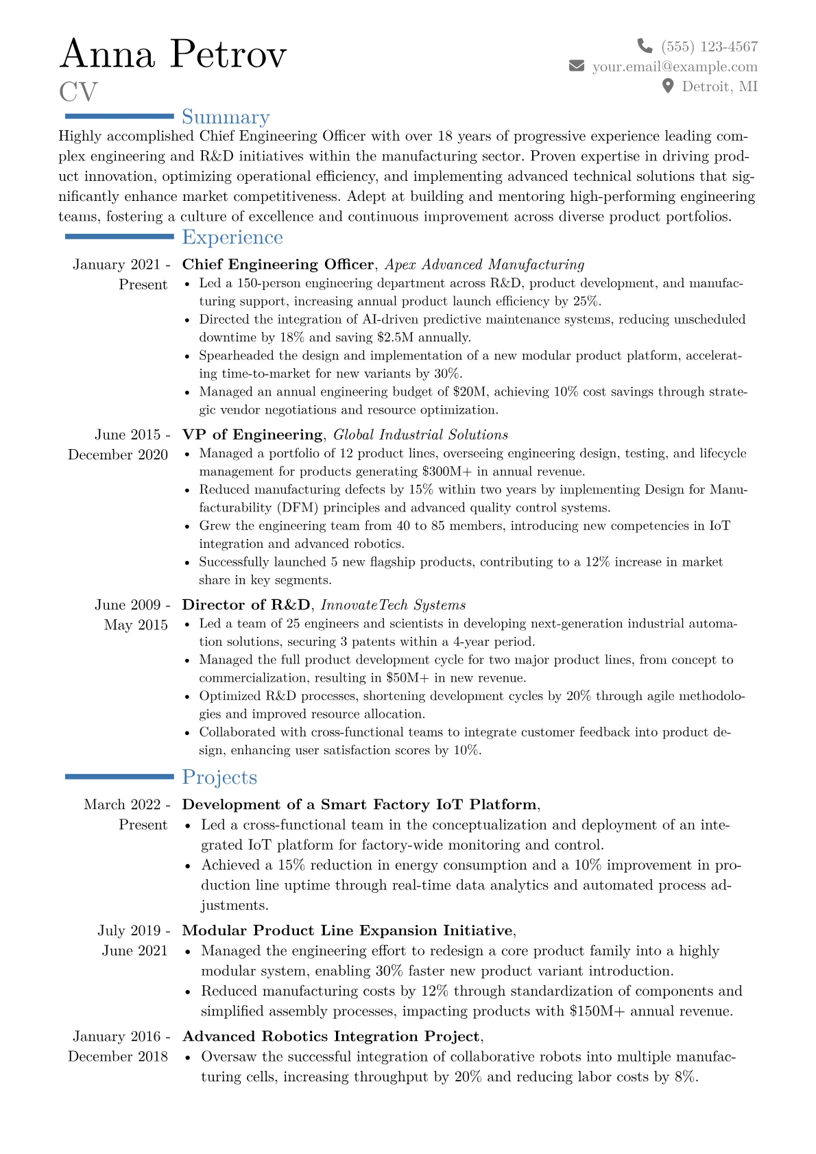 This example CV excels by immediately showcasing executive-level impact through an articulated "Key Achievements" section, quantifying results like "reduced operational costs by 18%." Skills are thoughtfully grouped into strategic categories such as "Technical Leadership," "Operational Excellence," and "Innovation & R&D," clearly articulating a breadth of capabilities. Furthermore, relevant certifications like PMP and specific industry-standard tools are prominently listed, providing immediate insight into the candidate's core proficiencies and leadership acumen in a manufacturing context.