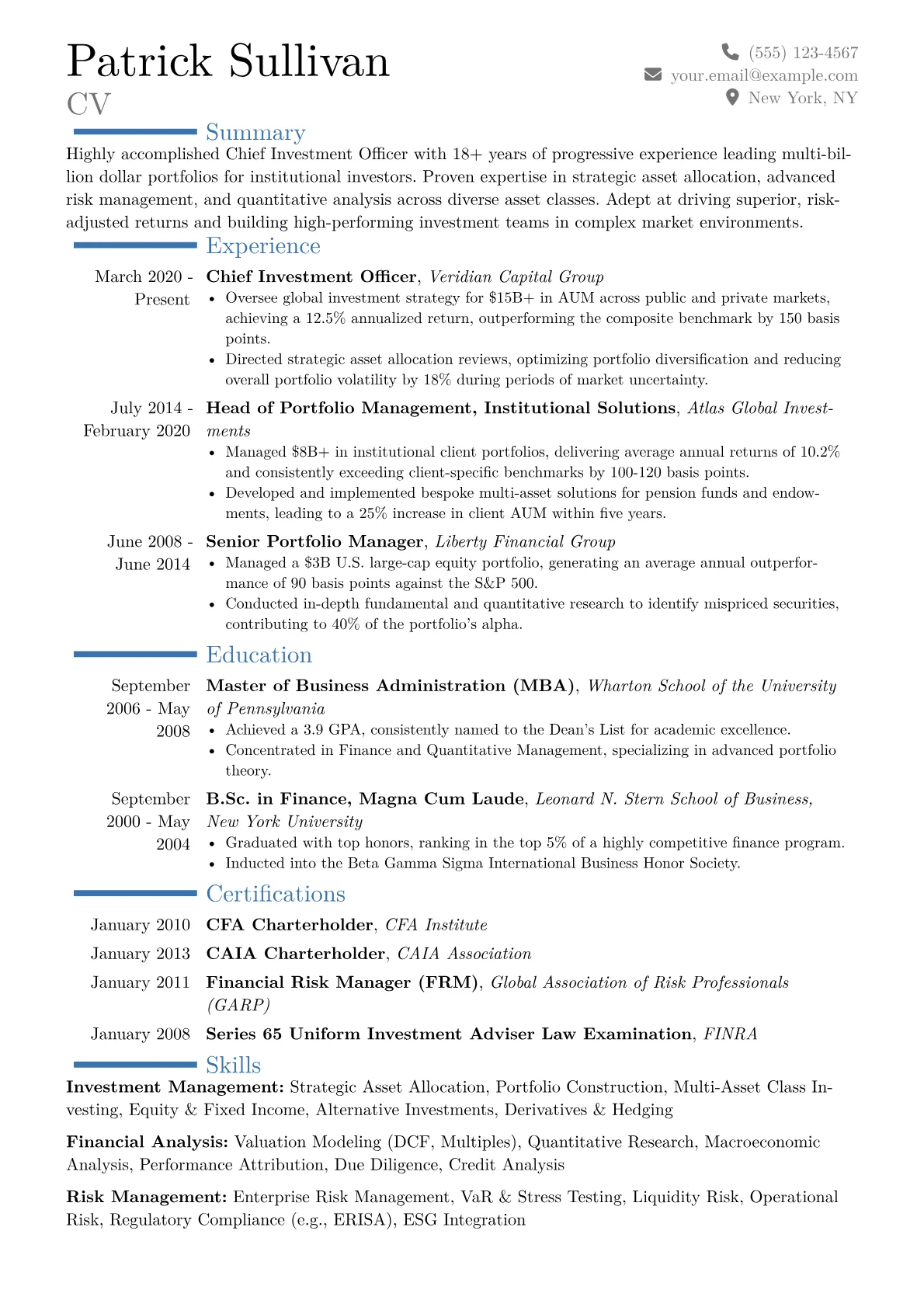 This example CV excels by meticulously quantifying impact, a critical element for this executive role. Achievements are presented with specific metrics, such as "increased AUM by X% over Y years" or "outperformed benchmark by Z basis points annually." Skills are thoughtfully grouped into categories like Investment Strategy, Portfolio Management, and Risk Oversight, highlighting both strategic acumen and operational proficiency. Furthermore, the resume effectively showcases a CIO's indispensable tools and certifications, prominently featuring the CFA charter and experience with platforms such as Bloomberg Terminal or Aladdin, demonstrating relevant technical mastery.