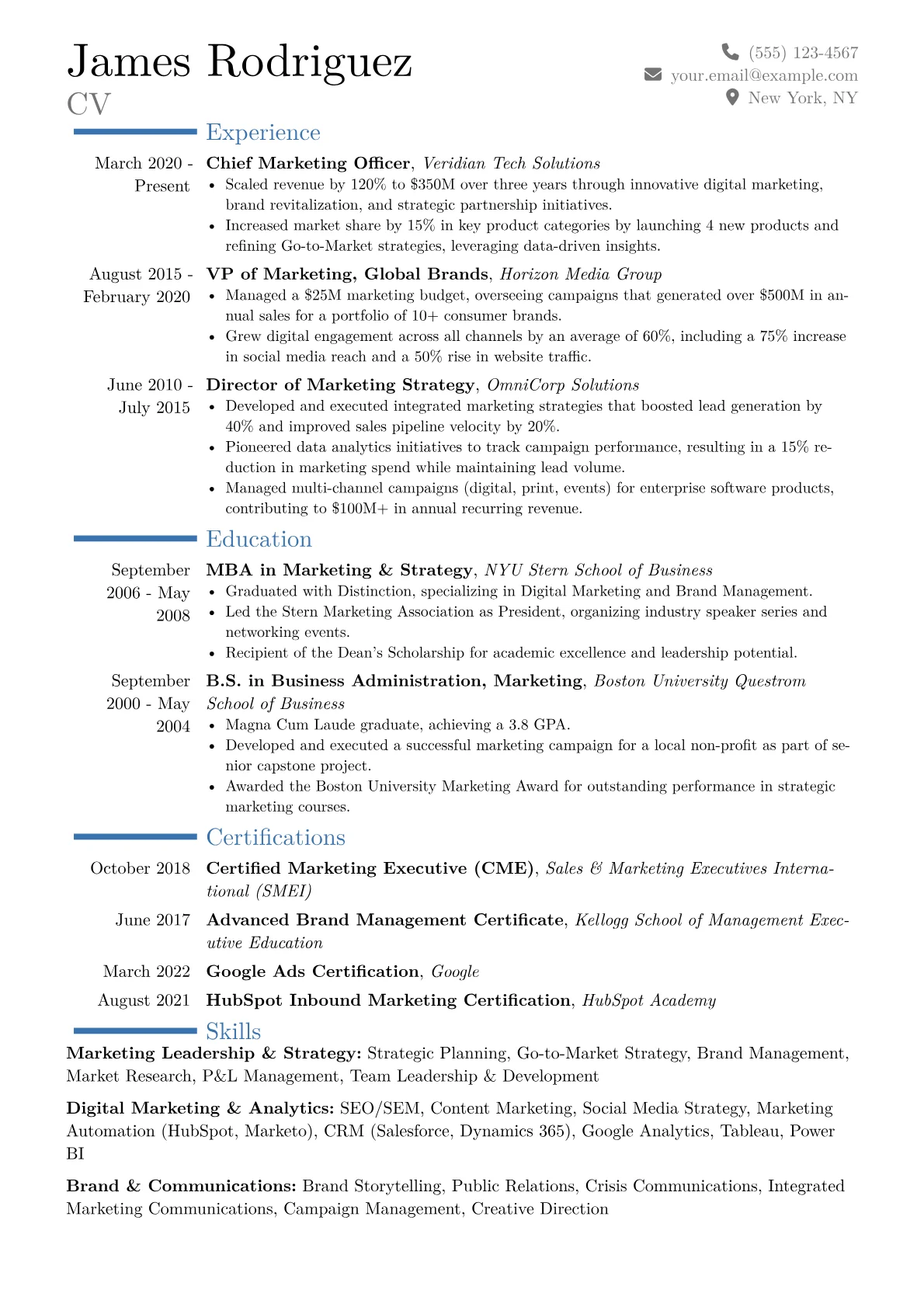 This example effectively showcases these crucial elements, presenting a strong narrative of executive achievement. It particularly excels through its use of meticulously quantified achievements, clearly illustrating ROI and business growth, alongside a strategically organized skills section that highlights both traditional and cutting-edge marketing competencies. The inclusion of relevant certifications further underscores a commitment to continuous learning in a dynamic field.