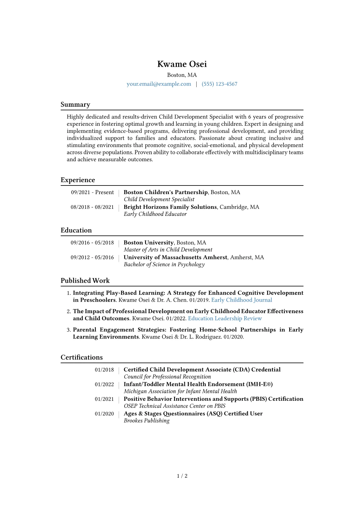 This template was built with JobSprout and can be remixed to create your own tailored Child Development Specialist resume, highlighting your unique experiences.