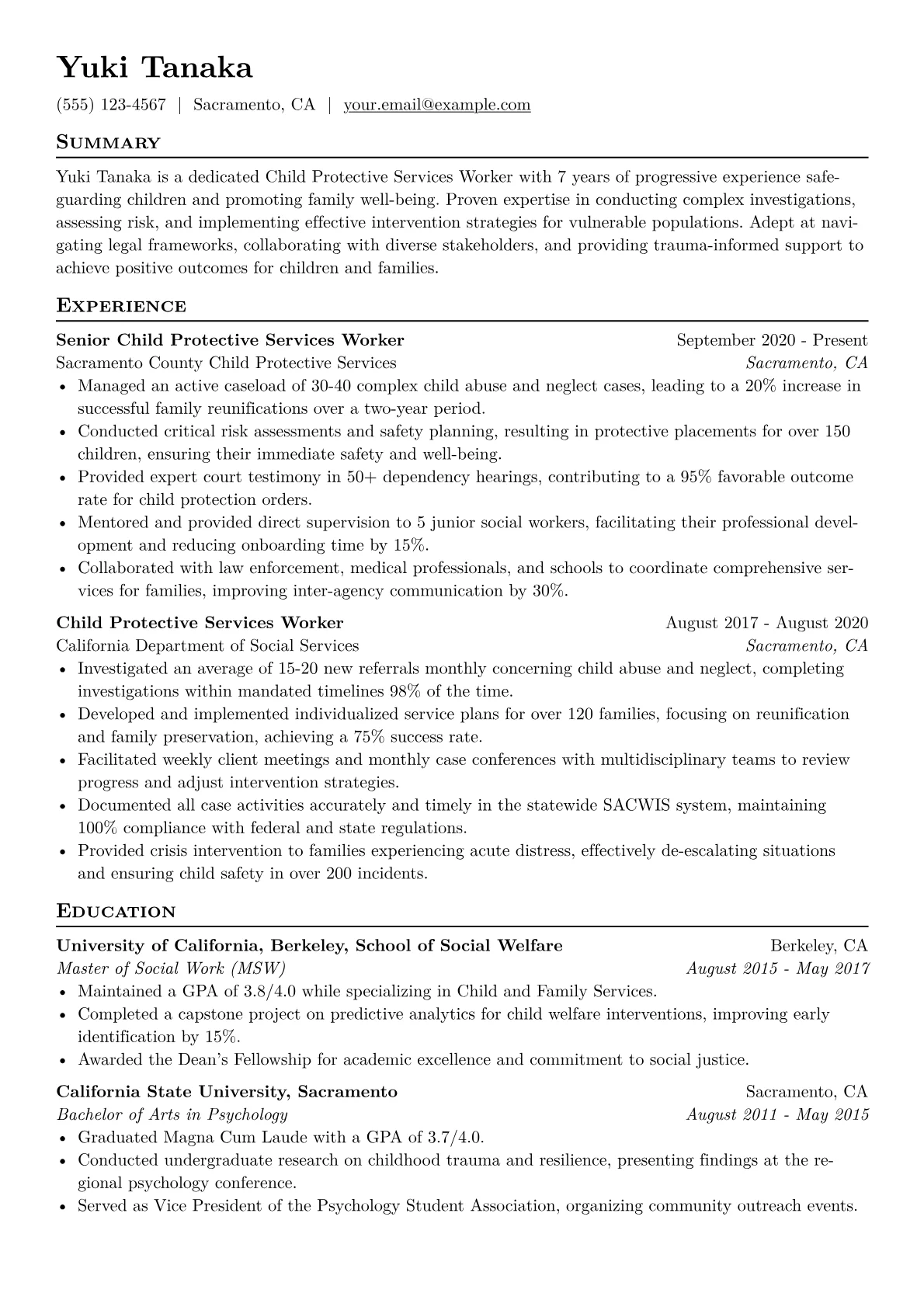 Crafting a compelling resume for a Child Protective Services Worker in government requires highlighting specific achievements in managing complex cases and navigating legal frameworks. Hiring managers look for demonstrated expertise in areas like permanency planning, family assessment, and court testimony. Concrete examples of success, such as improving reunification rates or effectively managing a high-volume caseload while adhering to state and federal regulations like ASFA or ICWA, are vital. Mentioning relevant certifications, like a state-specific social work license or specialized training in trauma-informed care, also significantly strengthens an application.