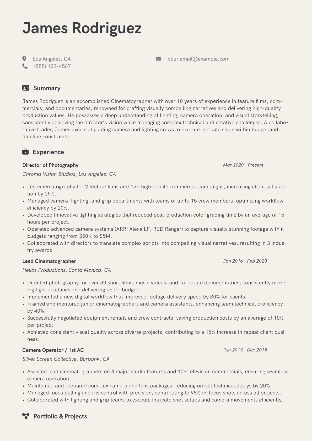 For a Cinematographer in Media and Entertainment, a resume must immediately convey visual expertise and technical prowess. Hiring managers seek clear project credits, specific camera systems mastered like ARRI or RED, and lighting techniques applied across diverse formats from feature films to commercials. Achievements should detail visual storytelling impact, often referencing specific looks or emotional tones achieved, alongside union affiliations like IATSE Local 600, prominent reel links, and any industry awards or festival selections. Experience with color grading software such as DaVinci Resolve is also a significant asset.