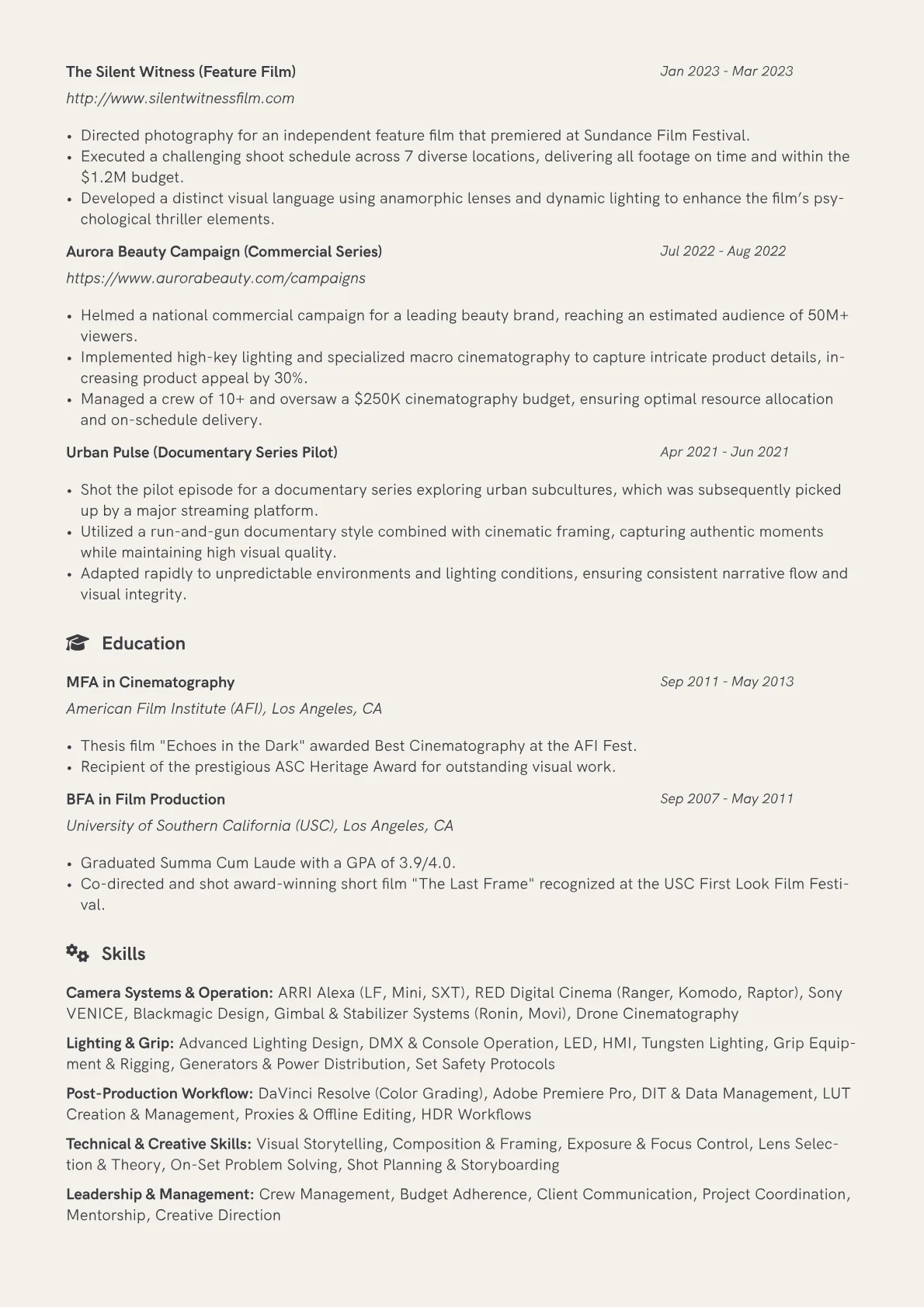 This example CV excels by featuring a high-visibility portfolio link, crucial for any visual role. It structures project experience with quantifiable achievements, for instance, detailing the specific camera packages and lens sets utilized on major productions or the visual impact metrics achieved. Skills are logically grouped by category, separating camera operation from lighting principles and post-production software, which helps hiring teams quickly assess technical breadth. Additionally, specialized certifications and industry awards are clearly highlighted, validating the candidate's professional standing.