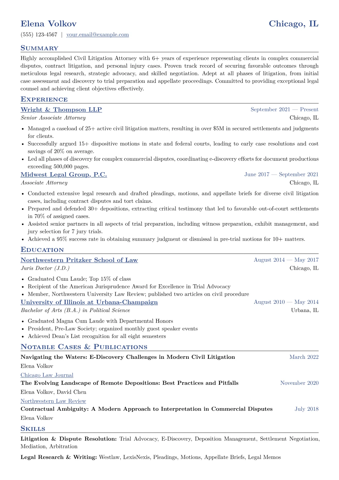 Hiring managers seeking a mid-level Civil Litigation Attorney prioritize demonstrable experience in key areas. They look for specific accomplishments in motion practice, such as drafting and arguing successful summary judgment motions, direct deposition experience, and clear contributions to trials, whether first or second chair. Quantifiable outcomes in settlement negotiations, proficiency with e-discovery platforms like Relativity, and active bar admissions are critical. Employers also value expertise in managing specific case types, like complex commercial disputes or tort defense, evidenced by concrete results and clear responsibilities.
